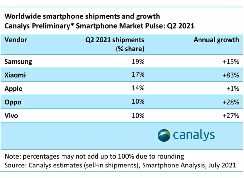 Xiaomi z 17-procentowym udziałem w rynku depcze po piętach liderowi. W porównaniu do okresu bazowego, producent z Niebiańskiego Imperium wysłał o 83% więcej modeli i wyprzedził Apple, które zwiększyło wysyłki o zaledwie 1%. Gigant z Cupertino zgarnął 14% rynku.