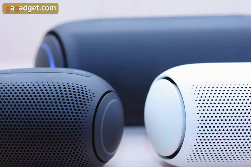 Najbardziej godną uwagi cechą XBOOM Go PL5 i PL7 jest dynamiczne oświetlenie RGB. W trybie włączonym trudno go nie zauważyć, ale po wyłączeniu w żaden sposób nie jest widoczny. Jest to przydatne, gdy chcesz zrezygnować z efektów świetlnych. A kiedy jest to właściwe, można nie tylko włączyć podświetlenie (jest do tego osobny przycisk na tylnym panelu), ale także dostosować jego zachowanie w aplikacji mobilnej. Dostępne są trzy ustawienia wstępne (Party, Water, Forest) oraz możliwość dostosowania własnych, wybierając szybkość i schemat kolorów. Możesz także zsynchronizować dynamikę zmiany podświetlenia z muzyką. Wygląda imponująco.