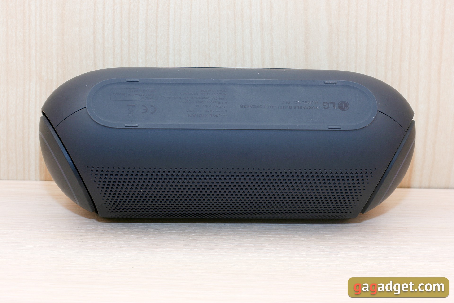 LG XBOOM Go PL7 to największy głośnik w ofercie. Półtora kilograma wagi, solidna, stabilna, imponująca konstrukcja. Zewnętrznie, poza rozmiarem, jest bardzo podobny do PL5. Te same boczne dyfuzory, oświetlenie LED, gumowy panel z przyciskami u góry i drugi pod osłoną z tyłu. Na tylnym panelu dodano jednak jeszcze jeden element: port USB-A do używania urządzenia jako mobilnej baterii i ładowania z niej innych gadżetów. Korpus, podobnie jak inne modele, jest przyjemny w dotyku: to praktyczny, niebrudzący matowy plastik z lekkim efektem soft touch.