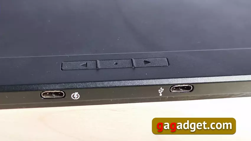 Monitor posiada własne proste menu, które jest obsługiwane przez trzy przyciski na obudowie. W pobliżu widać dwa złącza USB-C. Nie bardzo rozumiem po co są dwa złącza - jedno tylko do zasilania, drugie pozwala zarówno na zasilanie jak i przesyłanie obrazu, więc oczywiście korzystałem tylko z niego.