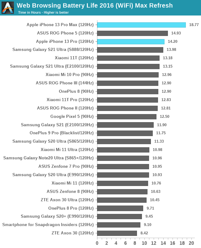 W trybie przeglądania stron WWW z częstotliwością 90 Hz i włączoną siecią Wi-Fi iPhone 13 Pro Max pracował na baterii przez ponad 21 godzin i 30 minut. iPhone 13 i iPhone 13 Pro również znalazły się w pierwszej trójce, osiągając o 5 godzin krótszy czas pracy.
