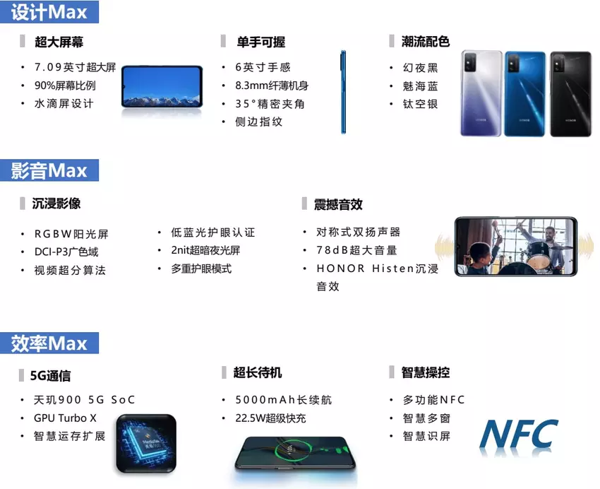 Pod maską Honor X30 Max będzie wyposażony w procesor MediaTek Dimensity 900. Układ będzie sparowany z modemem 5G, 8GB RAM, 128/256GB ROM, a także technologią ulepszania grafiki GPU Turbo X i funkcją rozszerzania pamięci RAM. Nowość będzie miała także podwójny aparat główny 64MP + 2MP (czujnik głębi), głośniki stereo Histen Sound, moduł NFC oraz baterię o pojemności 5000mAh. Będzie on obsługiwał szybkie ładowanie 22,5W.