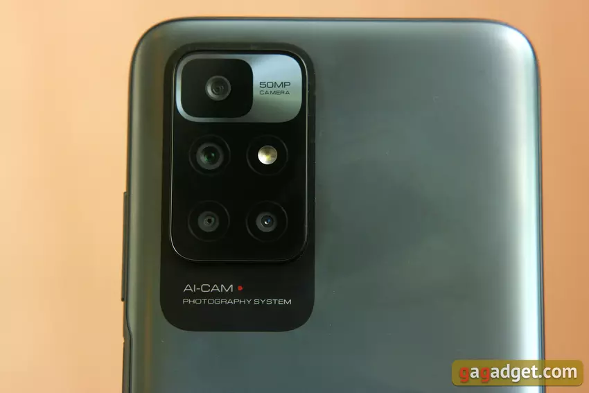 Tylna strona jest najdokładniej zbadana. Spójrzcie tylko na ten aparat! System fotograficzny AI-CAM to nie żart, Chińczycy wiedzą jak go wyolbrzymić. Jeden z aparatów jest wizualnie zarysowany osobną ramką i podpisany jako 50-megapikselowy. Tylko fizycznie w tym miejscu znajduje się nie ona, a 8-megapikselowy aparat ultraszerokokątny, którego główny moduł jest skromnie schowany poniżej. Ale to zabawna rzecz.