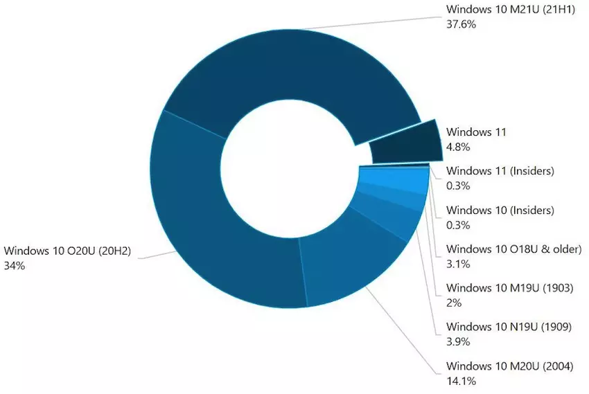 W każdym razie, Windows 11 jest już zainstalowany na ponad 5% komputerów PC. Stabilna wersja otrzymała 4,8% komputerów PC, a kolejne 0,3% skorzystało z Insider Preview. Tym samym wyprzedził on Windows 10 N19U / M19U / O18U. Ich udział wynosi odpowiednio 3,9%, 2% i 3,1%.