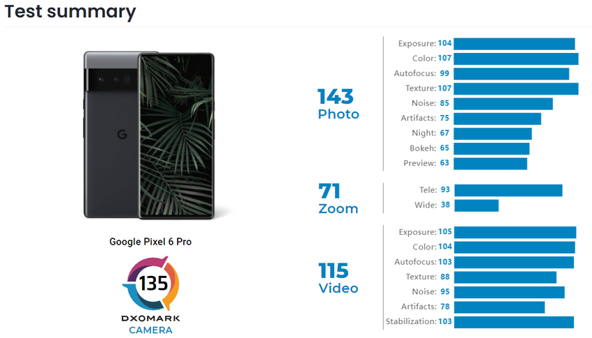 Mimo to, Google Pixel 6 Pro otrzymał 143 punkty za fotografię, podczas gdy możliwości wideo zostały ocenione na 115 punktów. Dla porównania, lider rankingu, którym jest Huawei P50 Pro zdobył odpowiednio 149 punktów i 126 punktów.
