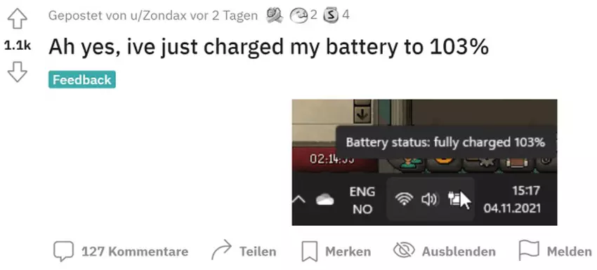 ?Jeden z użytkowników zamieścił zrzut ekranu na forum Reddit, pokazujący naładowanie baterii na poziomie 103%! dodał również, że liczba ta wzrosła później do 104%.