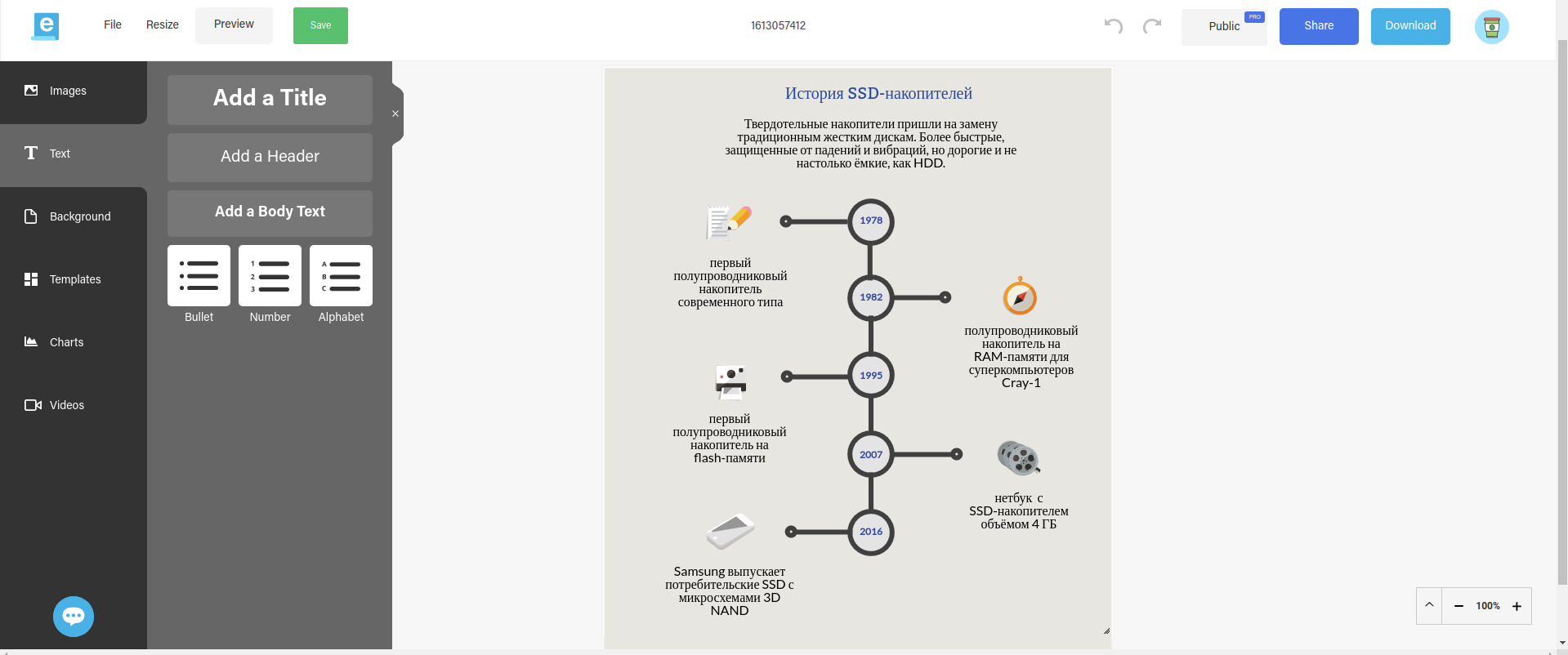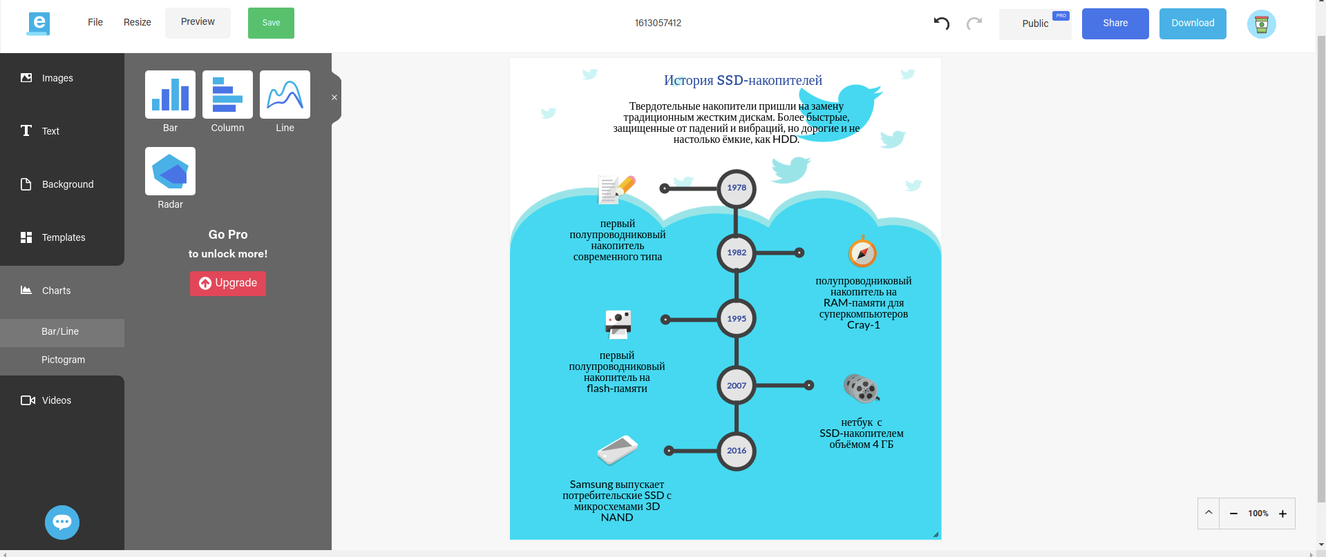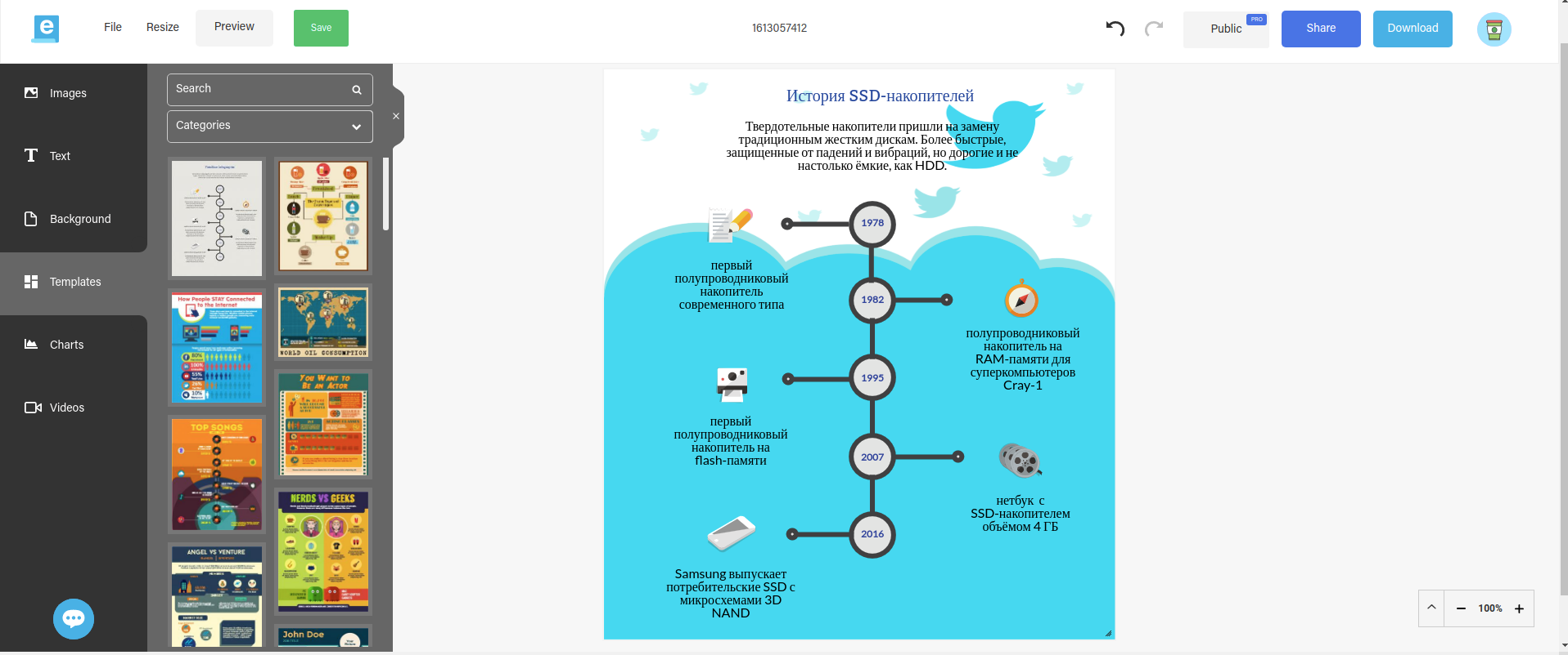 Easel.ly to prosty edytor wizualnych infografik.Dość zabawy, bierzmy się do pracy. A raczej ozdabiać wyniki naszej pracy w raportach i prezentacjach efektownymi infografikami. Ten darmowy serwis z licznymi gotowymi szablonami pozwala zaoszczędzić mnóstwo czasu, a jednocześnie jest świetnym źródłem inspiracji. A bez tego lepiej nie zajmować się wizualizacją danych, bo stałoby się to nudne. Tła, teksty, obrazy, kontury - wszystko jest konfigurowalne i edytowalne, możesz wziąć szablon, który Ci się podoba i zmienić go nie do poznania. Bardziej zaawansowane funkcje serwisu (więcej szablonów, zdjęć, ikon i innych gadżetów, zaawansowane opcje eksportu itp.) kosztują od 2 do 5 dolarów miesięcznie. Ważna uwaga: Lepiej składać raporty do komisji podatkowej bez żadnej grafiki informacyjnej, nie będą tego doceniać.