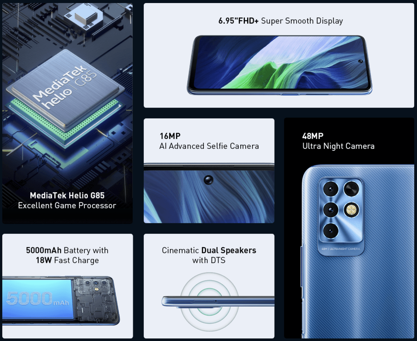 Nowość posiada duży, 6,95-calowy wyświetlacz IPS LCD o rozdzielczości 2460×1080p, proporcjach 20,5:9 i częstotliwości odczytu sensora 180 Hz. Pod maską, urządzenie jest napędzane przez procesor MediaTek Helio G85 ośmiordzeniowy sparowany z 4GB pamięci RAM i 64GB pamięci wewnętrznej. W razie potrzeby można go rozszerzyć za pomocą karty MicroSD.