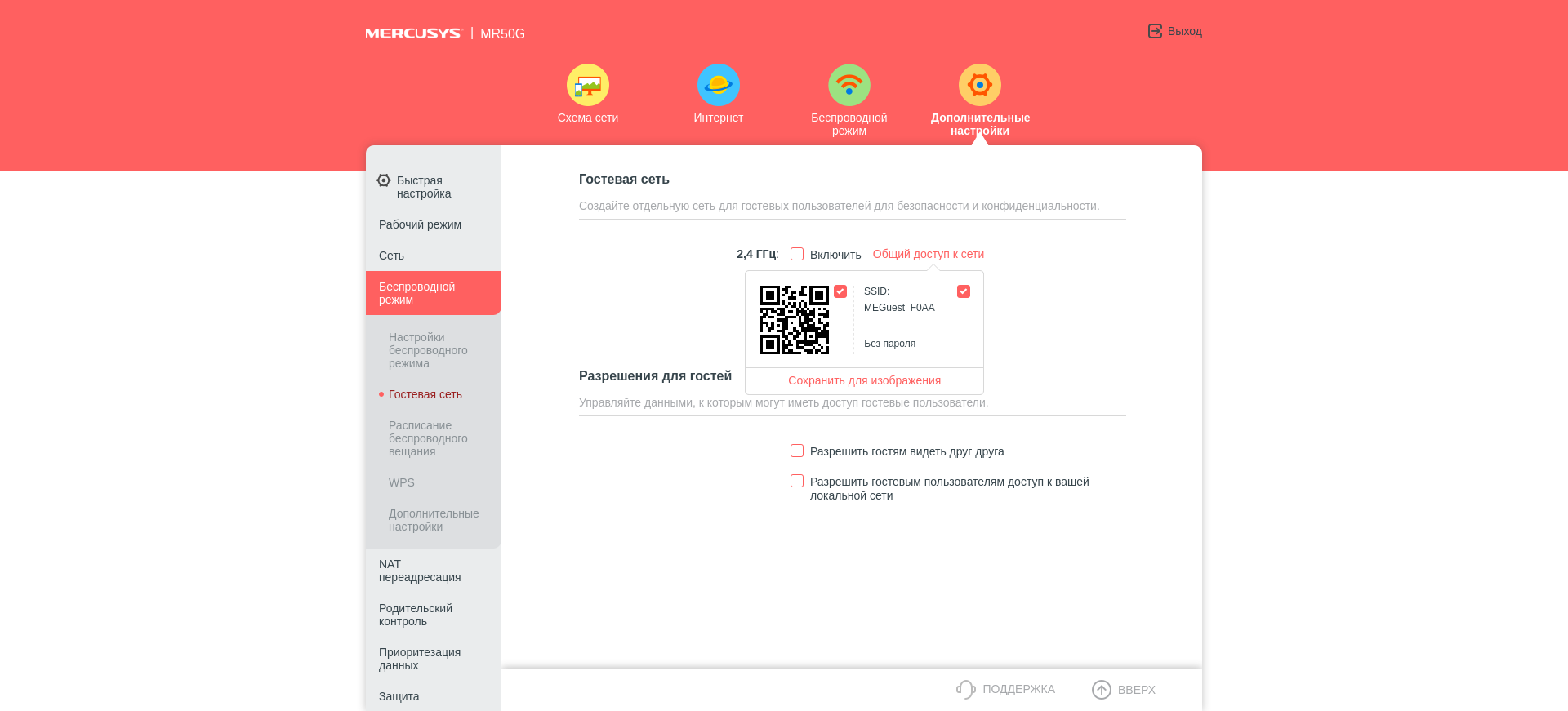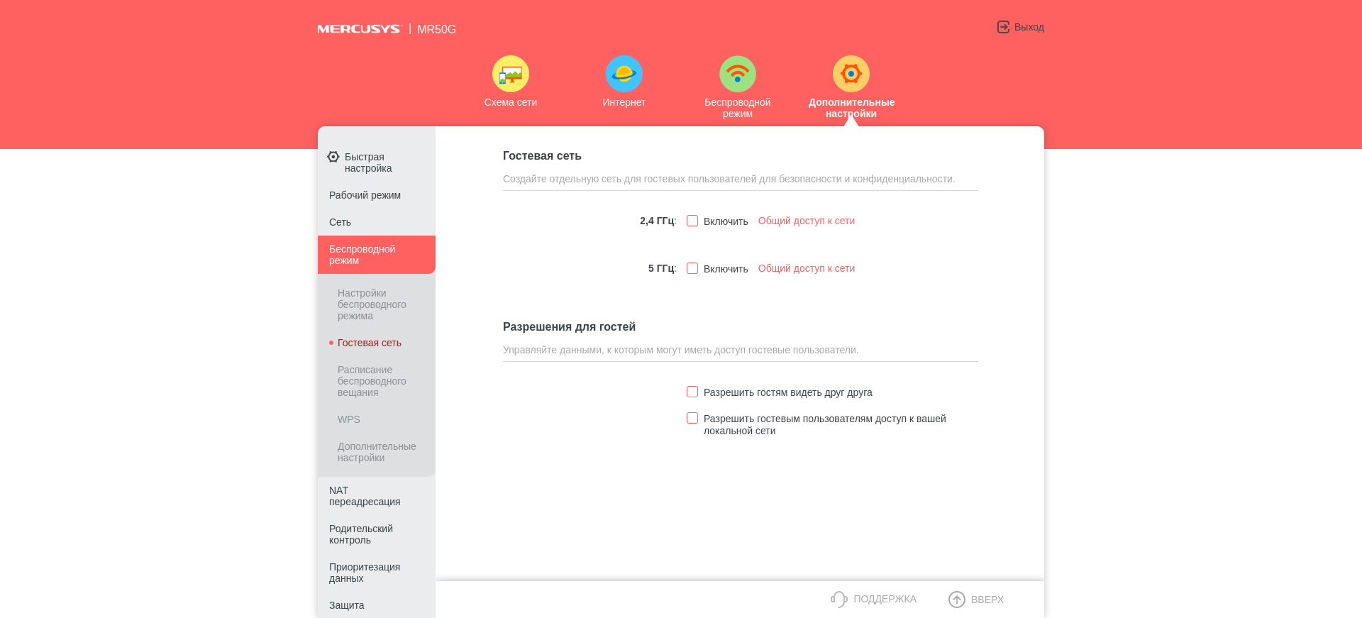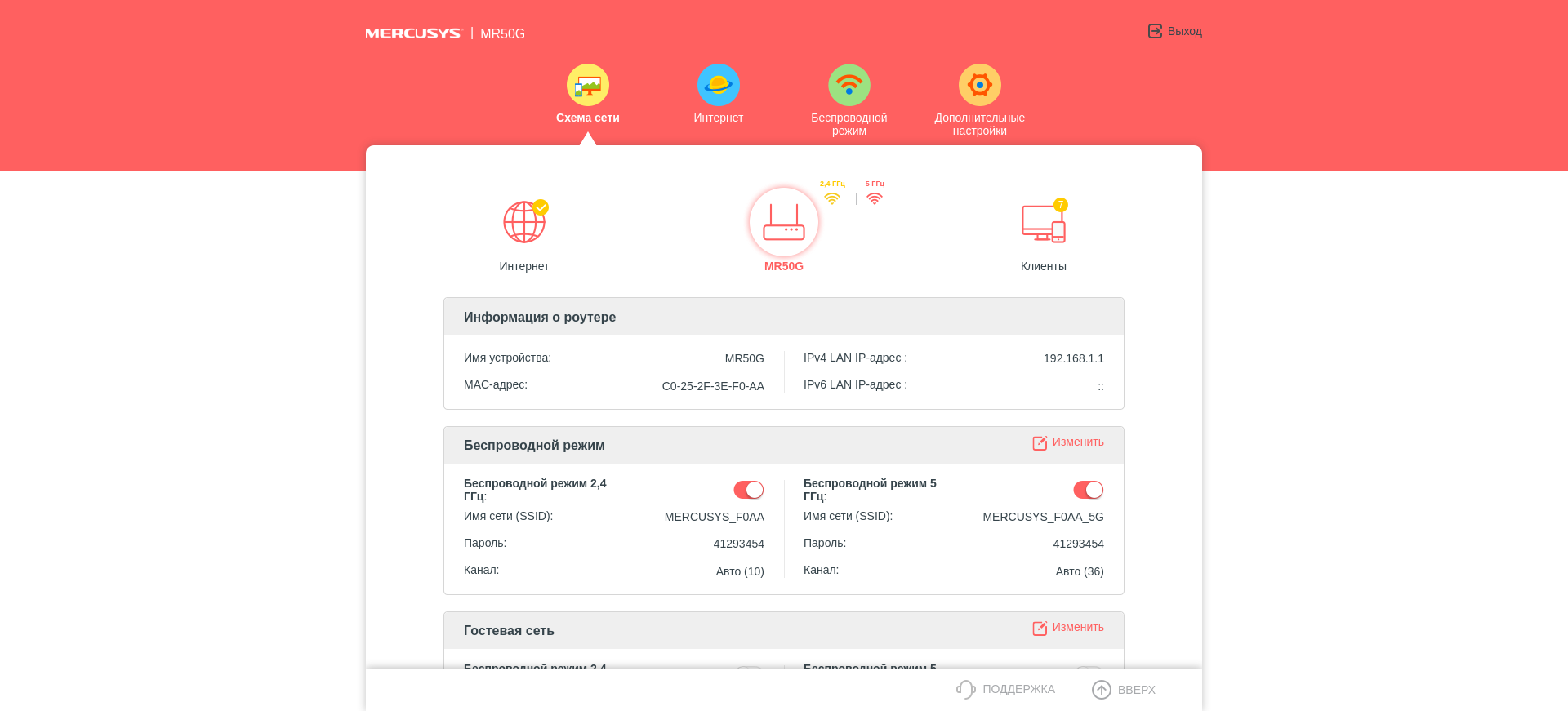 Podstawowe ustawienia są kontynuowane w sekcjach „Internet” i „Tryb bezprzewodowy”, gdzie można zmienić typ połączenia, adres MAC routera, nazwy i hasła do sieci bezprzewodowych. Istnieje funkcja sieci gości, do której nazwa i hasło są ustawiane osobno, a także dla każdego z zakresów. A zasięgi sieci głównej można połączyć pod jedną nazwą, włączając funkcję SmartConnect.