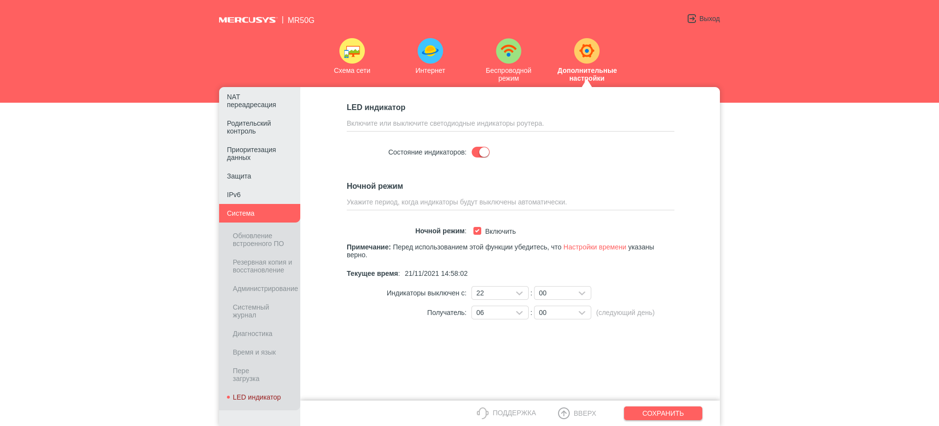 Wszystkie funkcje serwisowe umieszczone są w sekcji „System”. Z tego miejsca aktualizowane jest oprogramowanie routera (niestety tylko z pliku lokalnego, aktualizacje bezprzewodowo nie są dostarczane), ustawienia są archiwizowane i przywracane. Możesz zmienić hasło administratora, wybrać urządzenia, z których może się logować, czy włączyć możliwość zdalnego sterowania przez Internet. Dostępny jest dziennik zdarzeń systemowych, narzędzia diagnostyczne ping i traceroute, ponowne uruchomienie routera (natychmiastowe lub zgodnie z niestandardowym harmonogramem), a także ustawienia wskaźników LED (można go wyłączyć automatycznie o określonej porze dnia).