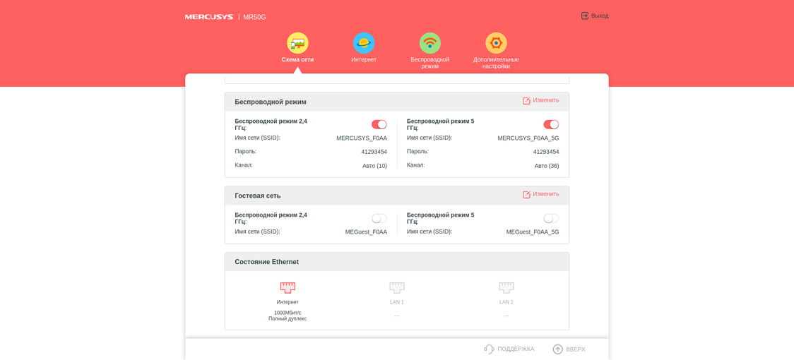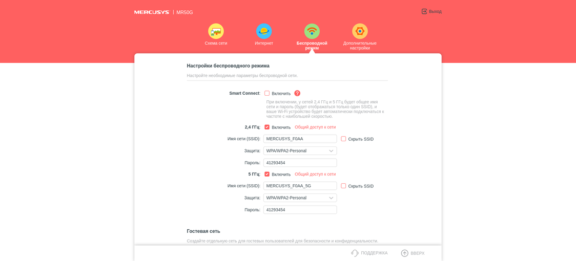 Podstawowe ustawienia są kontynuowane w sekcjach „Internet” i „Tryb bezprzewodowy”, gdzie można zmienić typ połączenia, adres MAC routera, nazwy i hasła do sieci bezprzewodowych. Istnieje funkcja sieci gości, do której nazwa i hasło są ustawiane osobno, a także dla każdego z zakresów. A zasięgi sieci głównej można połączyć pod jedną nazwą, włączając funkcję SmartConnect.