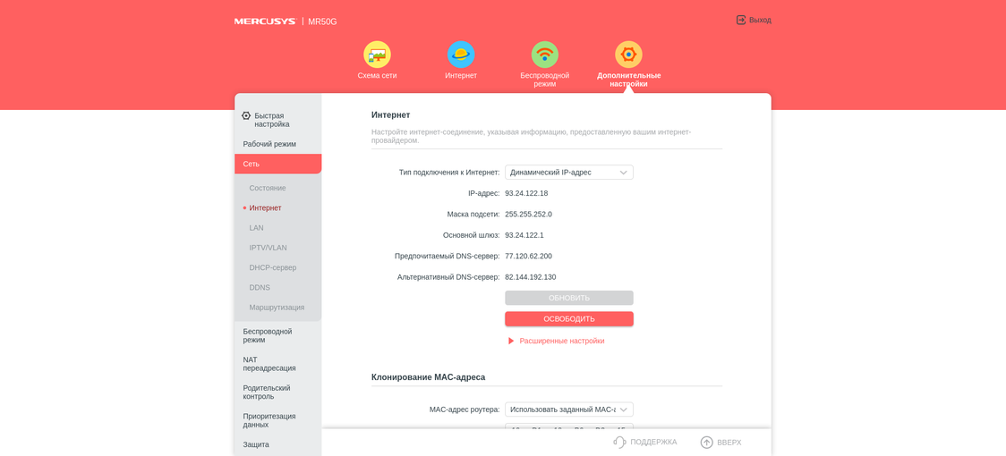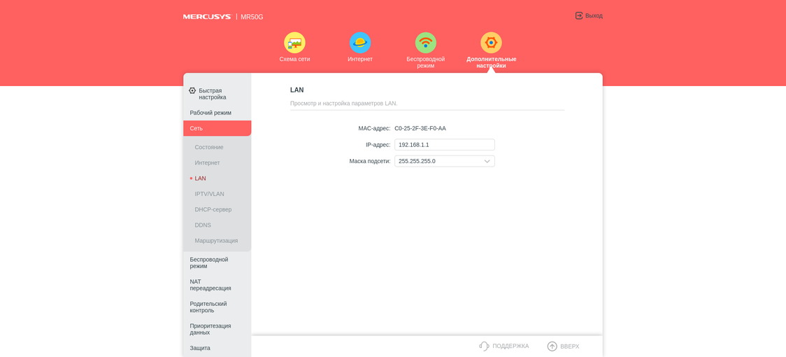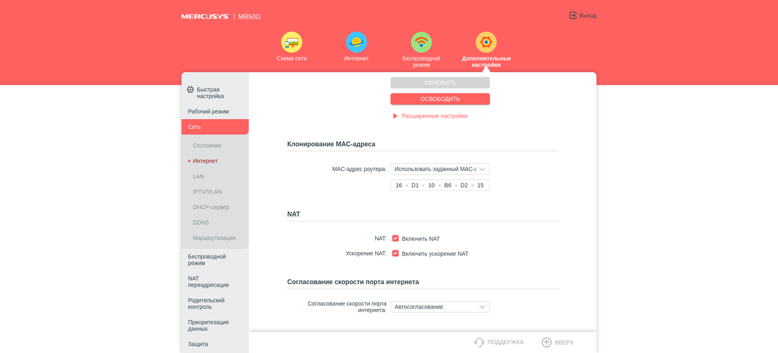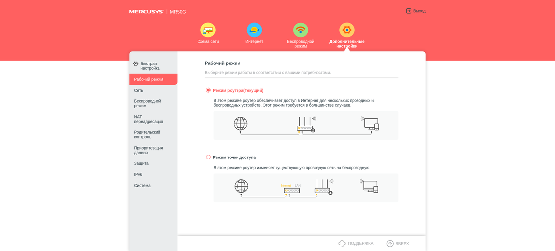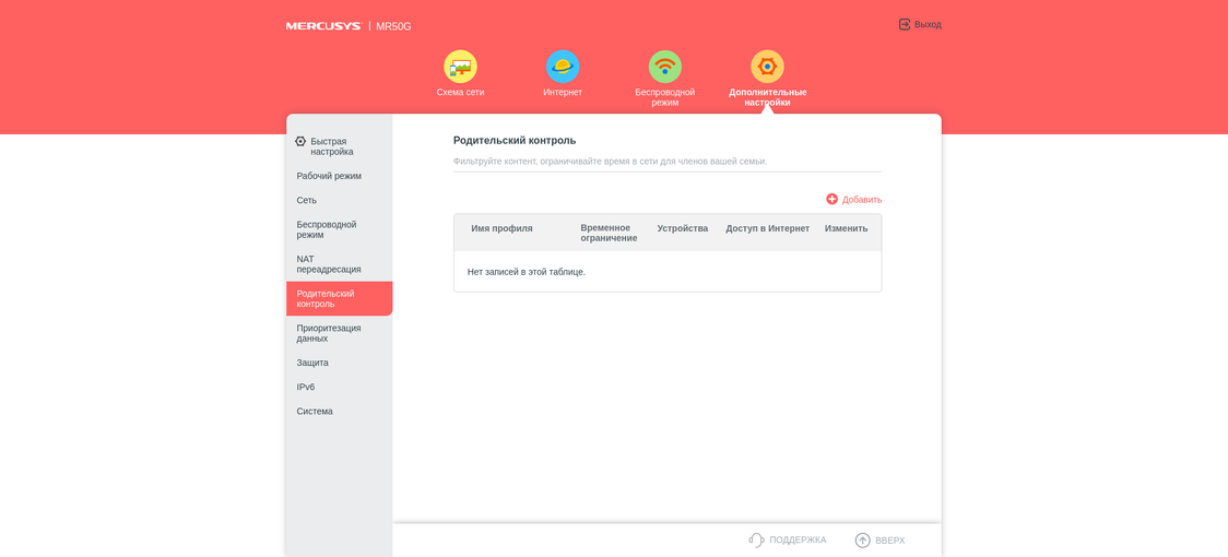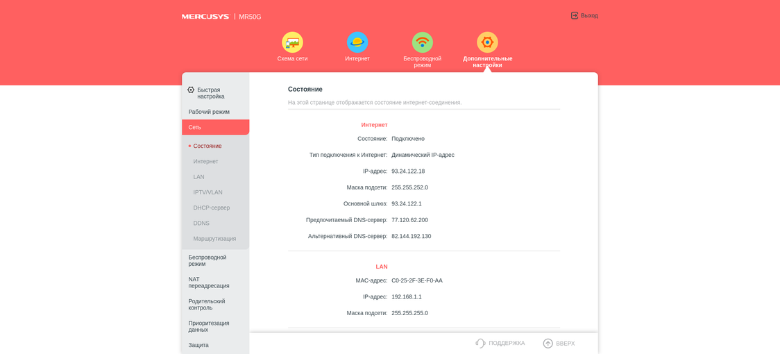 Jeśli zagłębimy się nieco głębiej, zobaczymy, że Mercusys MR50G obsługuje technologie MU-MIMO, aby zoptymalizować równoczesną pracę z wieloma urządzeniami, oraz Beamforming, aby poprawić zasięg sieci bezprzewodowej w trudno dostępnych miejscach. Istnieje możliwość połączenia obu zakresów komunikacji pod jedną nazwą (SSID) za pomocą jednego hasła dostępowego, funkcja ta nazywa się SmartConnect. Istnieje wsparcie dla IPTV, VLAN i IPv6, najprostszej zapory ogniowej i funkcji kontroli rodzicielskiej, ale nie ma możliwości stworzenia serwera VPN. Ale już weszliśmy do ustawień, więc przyjrzyjmy się im dokładniej.