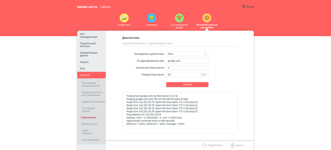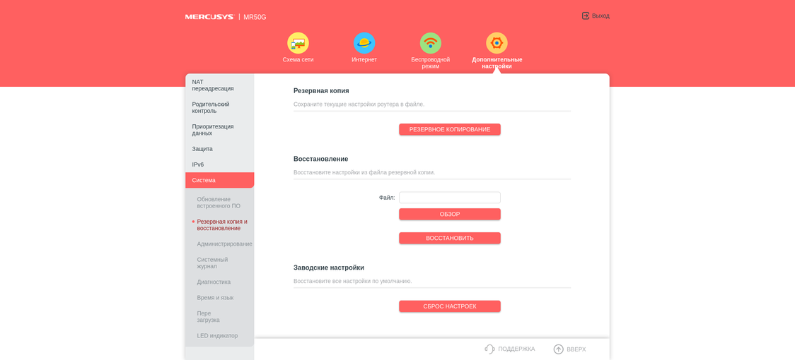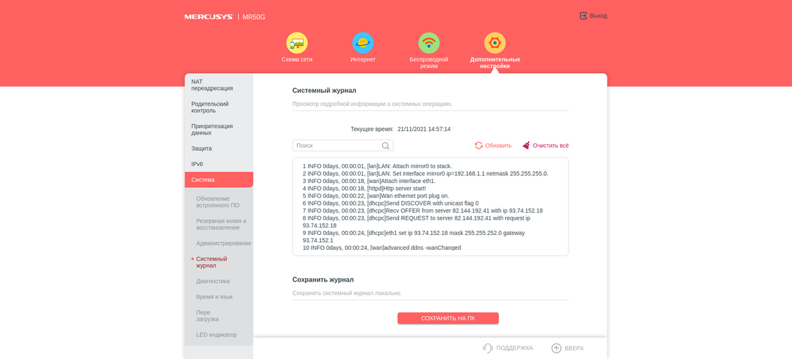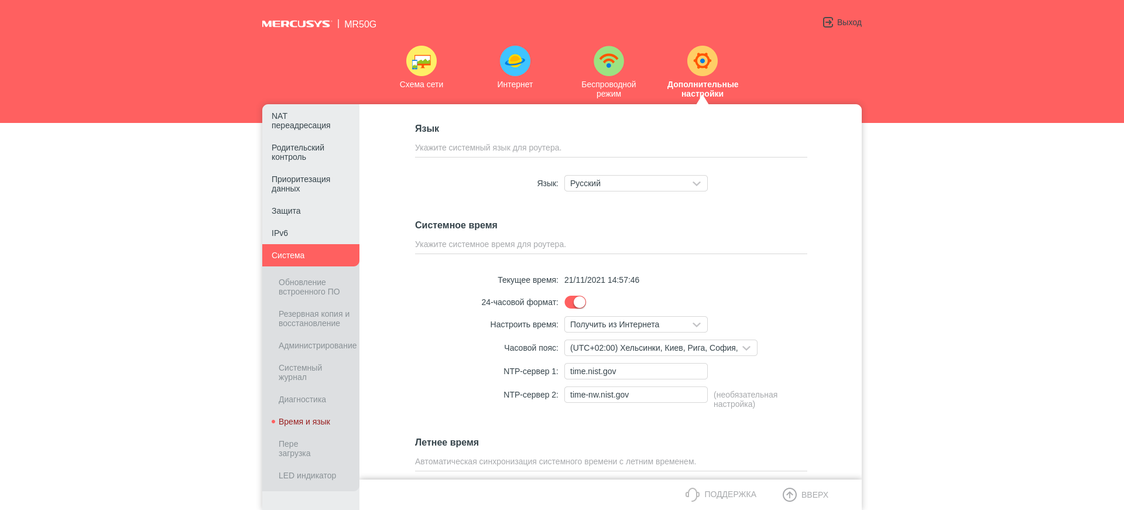 Wszystkie funkcje serwisowe umieszczone są w sekcji „System”. Z tego miejsca aktualizowane jest oprogramowanie routera (niestety tylko z pliku lokalnego, aktualizacje bezprzewodowo nie są dostarczane), ustawienia są archiwizowane i przywracane. Możesz zmienić hasło administratora, wybrać urządzenia, z których może się logować, czy włączyć możliwość zdalnego sterowania przez Internet. Dostępny jest dziennik zdarzeń systemowych, narzędzia diagnostyczne ping i traceroute, ponowne uruchomienie routera (natychmiastowe lub zgodnie z niestandardowym harmonogramem), a także ustawienia wskaźników LED (można go wyłączyć automatycznie o określonej porze dnia).