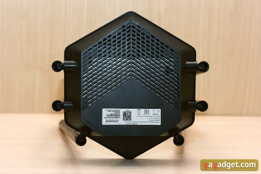 Dolna część zakryta jest kratką wentylacyjną, tutaj również znajdziesz naklejkę z parametrami podłączenia do routera. Nie ma specjalnych nóżek antypoślizgowych ani otworów do montażu na ścianie. Szkoda, byłby to elegancki element projektu high-tech, coś w rodzaju trofeum z polowania na obce owady.