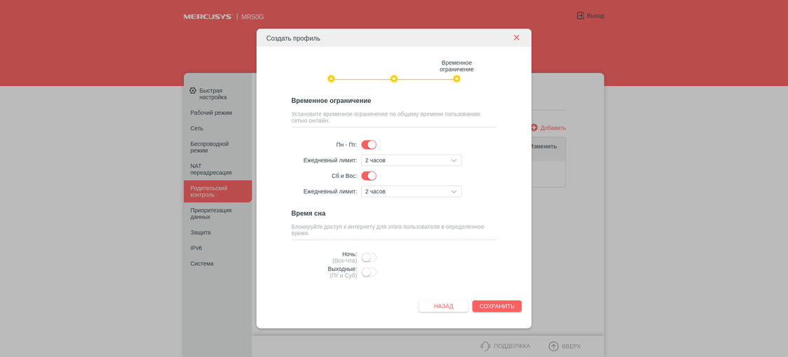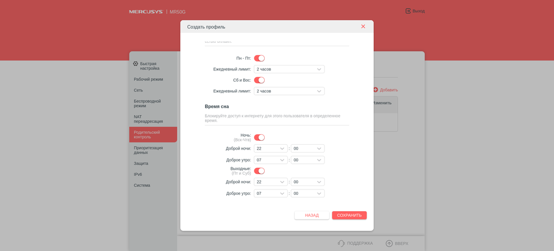 "Kontrola rodzicielska" działa w następujący sposób. Tworzymy profil użytkownika, wybieramy z listy urządzeń podłączonych do routera te, które do niego należą, a następnie wybieramy ograniczenia, które będą obowiązywać tego użytkownika. System obsługuje zarówno filtrowanie adresów, jak i harmonogram korzystania z Internetu.