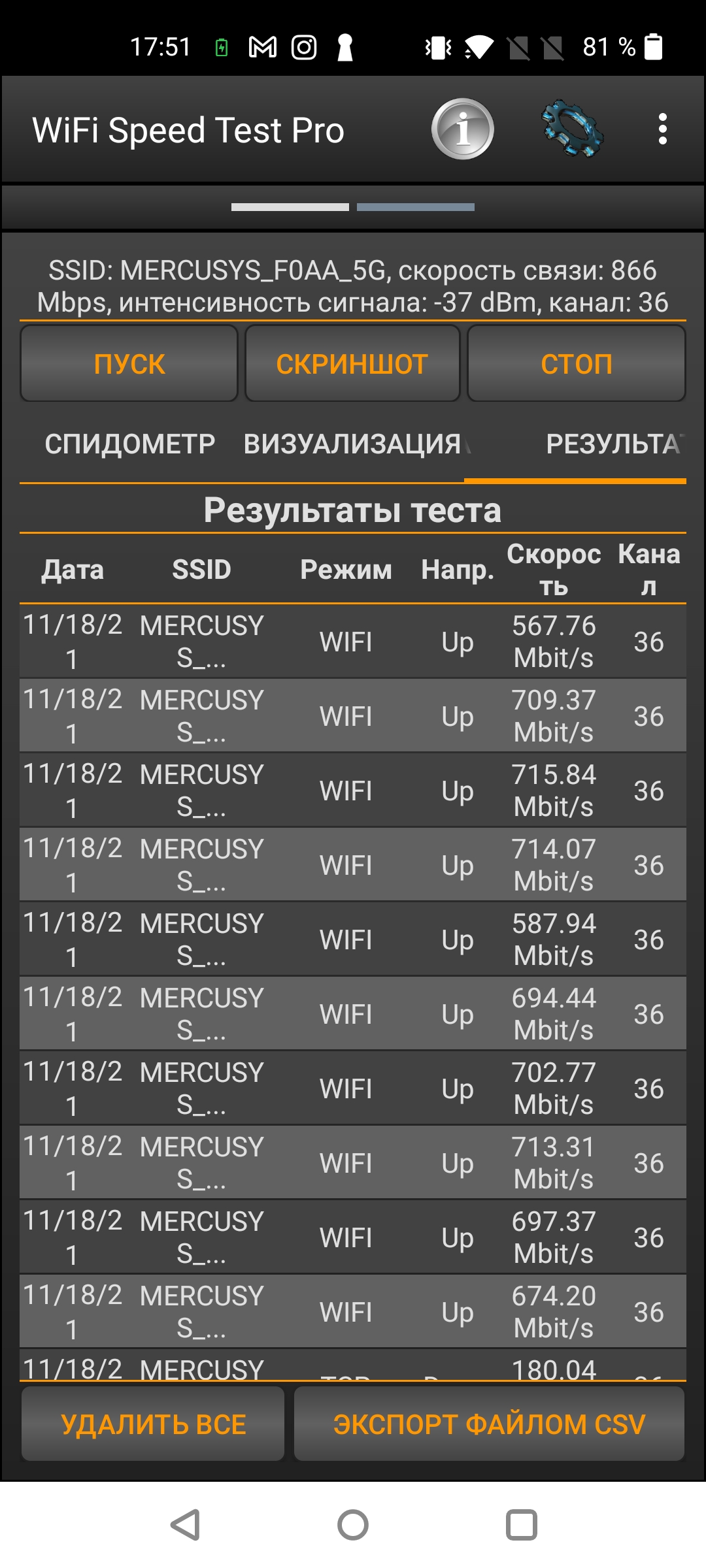 To jest nasz standardowy router AC1900, co oznacza, że jego maksymalne możliwe prędkości w dwóch pasmach (odpowiednio 5 i 2,4 GHz) powinny mieć właśnie tę wartość, czyli 1300 + 600 = 1900. Do tego mamy gigabitowe porty Ethernet, więc prędkość do użytku domowego powinna wystarczyć. Co dziwne, podczas testowania routera nie było żadnych skarg ze strony użytkowników domagających się „gier” prędkości sieci, ale i tak polecam zagorzałym graczom przyjrzenie się bardziej wyspecjalizowanym rozwiązaniom. Średnie prędkości w testowych pomiarach nie osiągają oczywiście maksimów, ale były też rejestrowane w warunkach dalekich od idealnych. W benchmarku mobilnego WiFi Speed Test Pro realna średnia prędkość w paśmie 5 GHz sięga 700 Mb/s, a przy 2,4 GHz dąży do 100 Mb/s. To około 10-15% wolniej niż w przypadku Mercusys MR70X, które testowaliśmy wcześniej, ale tę różnicę obserwuje się tylko na urządzeniach z Wi-Fi 6. W przypadku starszych klientów różnica w szybkości między MR50G i MR70X mieści się w granicach błędu pomiaru.
