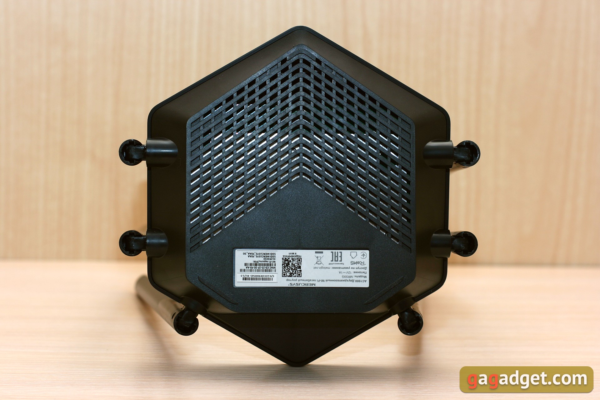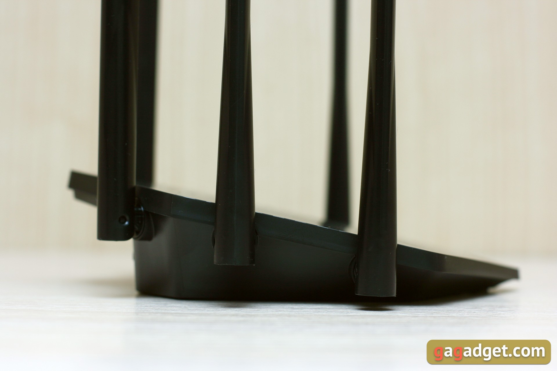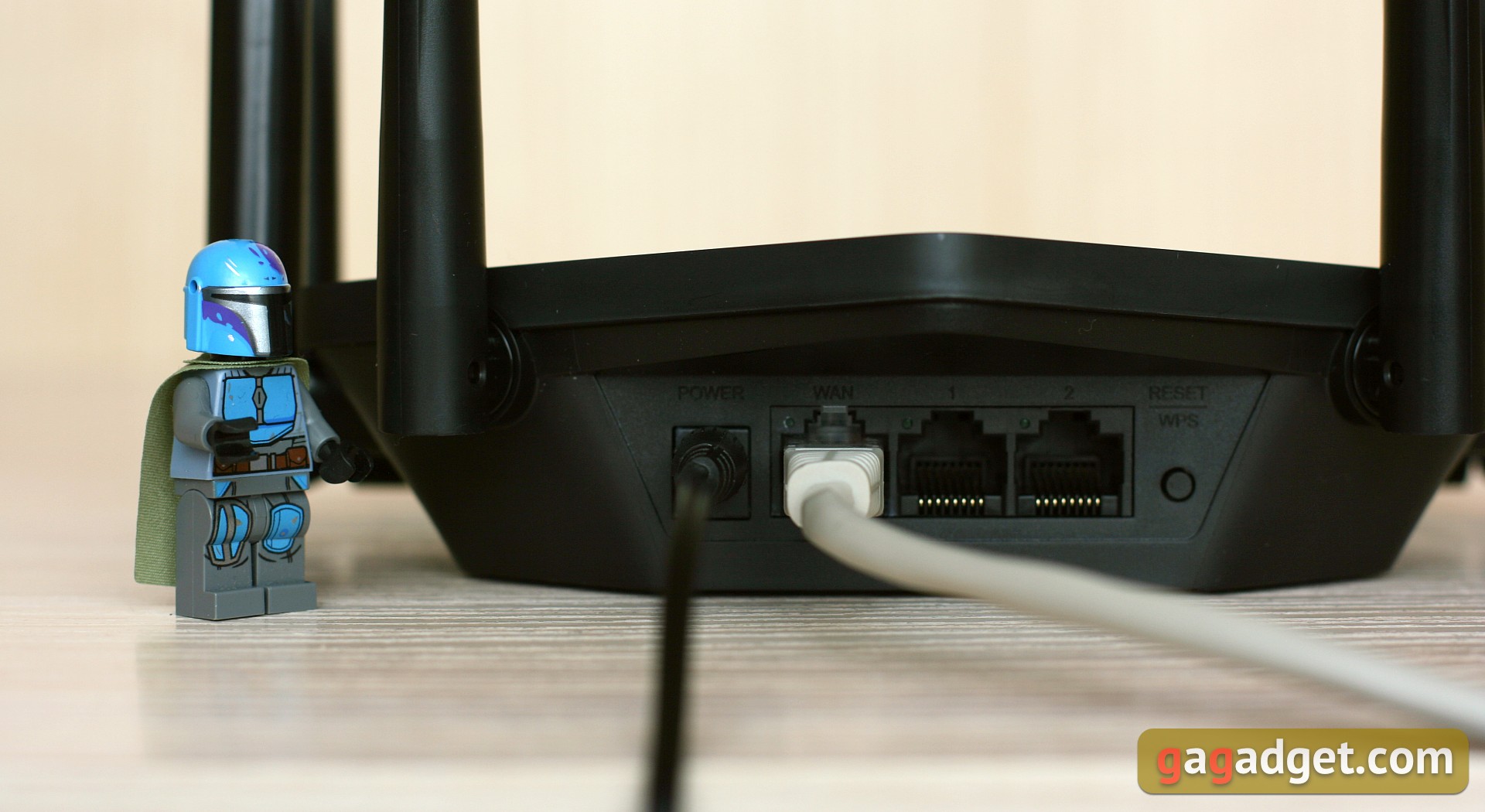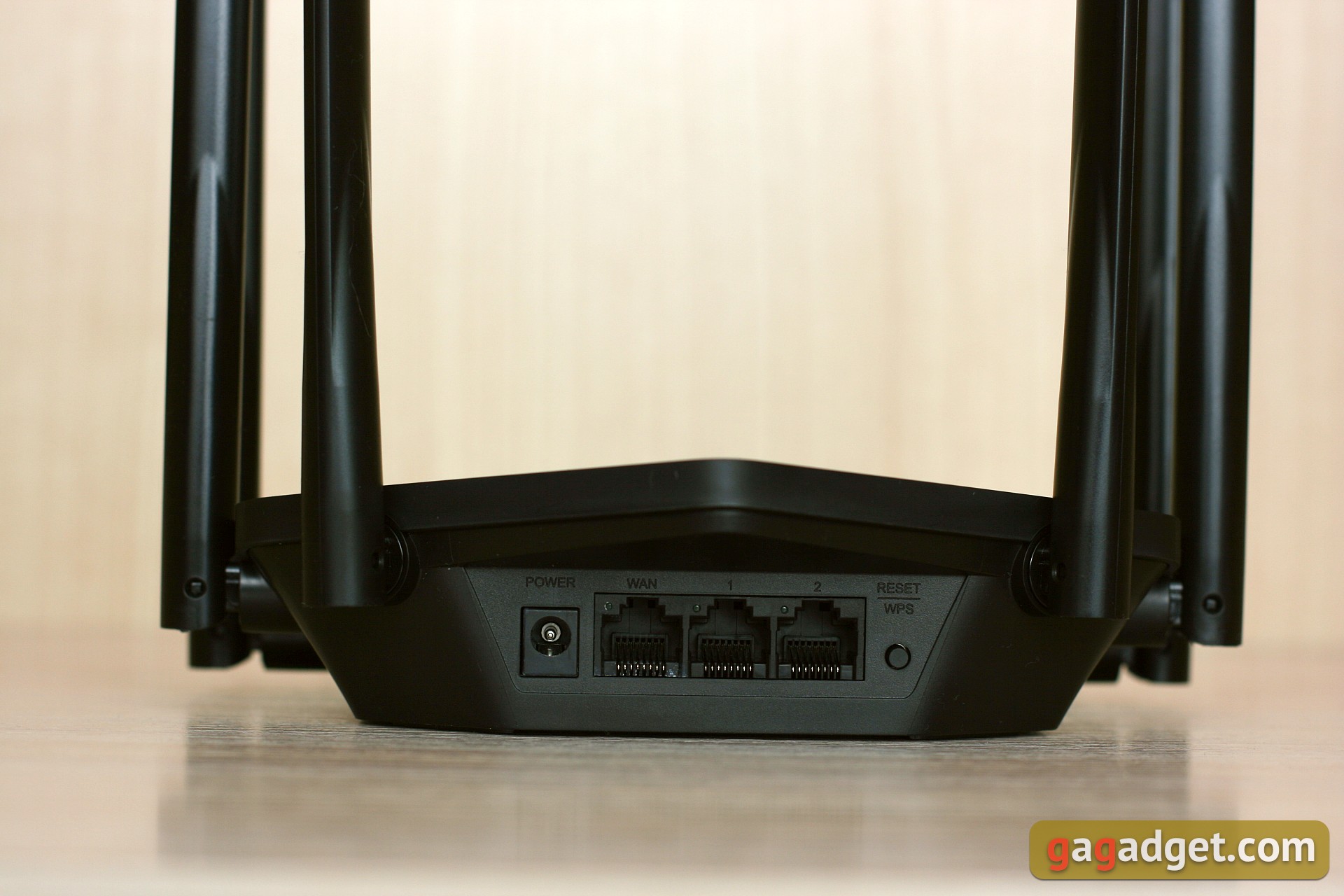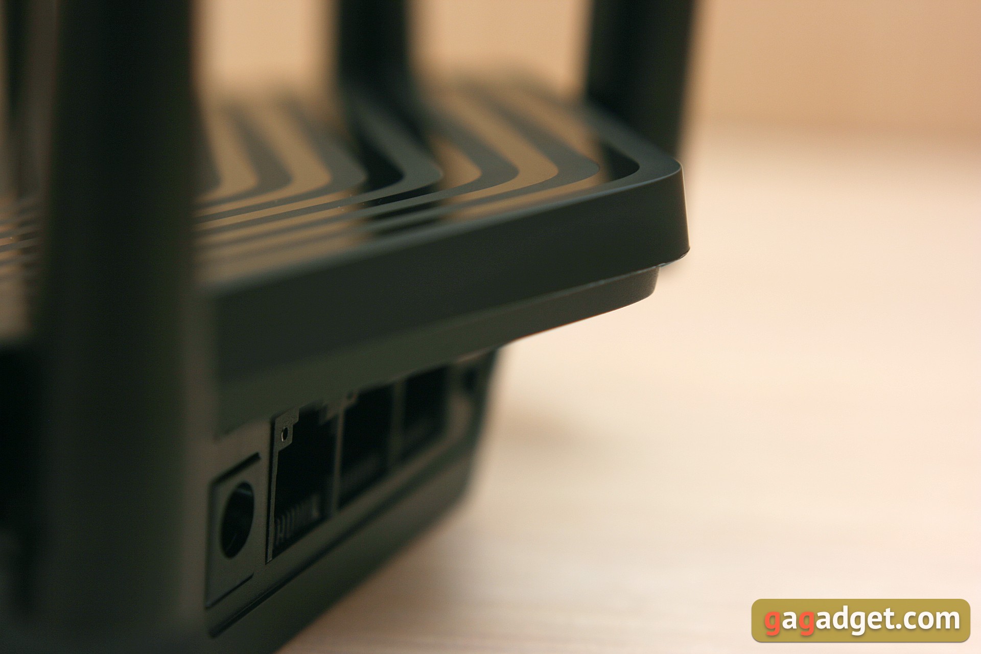 Nie ma przedniego panelu w tradycyjnym tego słowa znaczeniu, górna część jest umieszczona pod kątem do podstawy, jest wyraźnie widoczna z boku. Na bocznych częściach znajdują się mocowania antenowe, po dwie sztuki na każdym. Dwie pozostałe anteny są przymocowane do tylnego panelu. Pomiędzy nimi znajduje się złącze zasilania, przycisk WPS (odpowiada również za przywracanie ustawień fabrycznych) oraz trzy porty RJ-45: jeden WAN i dwa LAN. Każdy port sieciowy ma małą diodę LED aktywności.