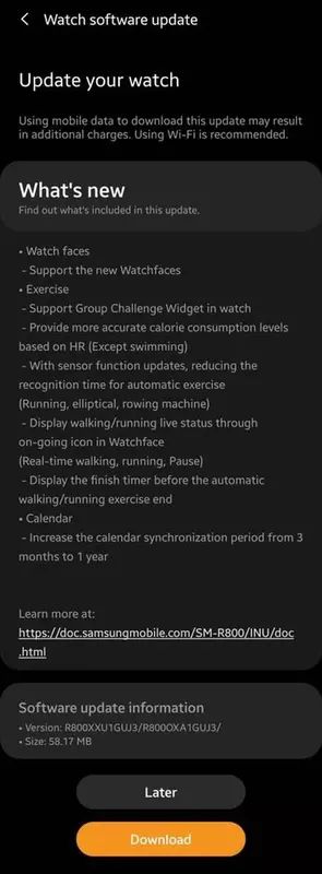 Zegarek otrzymał 10 nowych tarcz, które wcześniej były dostępne wyłącznie dla Galaxy Watch 4 i Galaxy Watch 4 Classic. Użytkownicy mogą je dostosowywać. Na przykład zmień tło, kolor tekstu i animowane elementy. Oprócz tarcz zegarek otrzymał również obsługę widżetów Group Challenge i ulepszony odczyt kalorii. Również w nowym systemie zoptymalizowano czujnik, który odpowiada za automatyczne wykrywanie treningów. Ten proces będzie teraz szybszy.