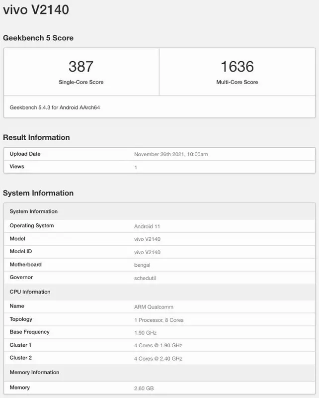 Urządzenie dostarczane jest z numerem modelu V2140. Podobno to Vivo Y21e. Raport mówi, że smartfon będzie zasilany przez chip Qualcomm, kryptonim Bengal. Mowa o nowym procesorze Snapdragon 680, który zadebiutował pod koniec października. Oznacza to, że Vivo Y21e będzie pierwszym lub jednym z pierwszych smartfonów, które otrzymają nowy SoC Qualcomm.