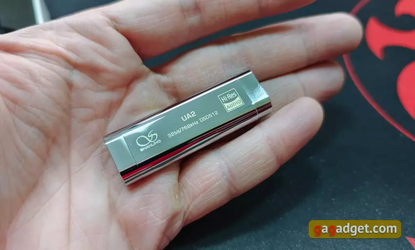 Wszystkie takie przenośne przetworniki/wzmacniacze są popularnie nazywane „gwizdkami”. I nie na próżno jest coś wspólnego zarówno pod względem formy, jak i wielkości. Shanling UA2 ma bardzo kompaktowy rozmiar, który jest nieco mniejszy niż standardowa zapalniczka. I wykonany w całości z metalu. Istnieje bardziej praktyczna czarna opcja. Dotarła do nas wersja Chrome. Wygląda fajnie i bogato, ale natychmiast pozostawia odciski. Podejrzewam też, że rysy.