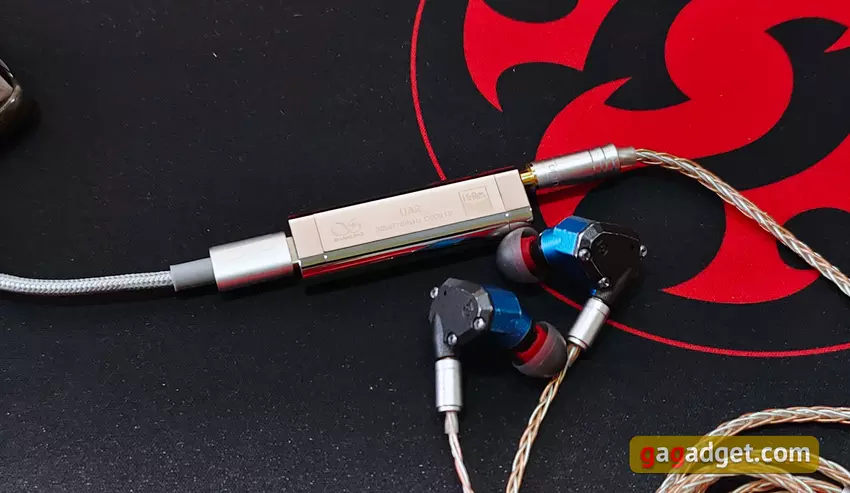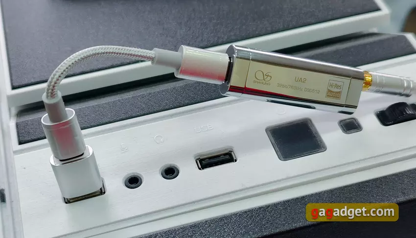 Na tym kończą się funkcje użytkowania. Pozostaje dodać, że DAC zasilany jest ze źródła. A zatem smartfon szybciej usiądzie, jeśli słuchasz muzyki przez długi czas. Ale zużycie zależy w dużej mierze od głośności i poziomu wzmocnienia, więc trudno podać dokładne liczby. Podczas pracy Shanling UA2 nagrzewa się, ale ogrzewanie jest minimalne. DAC lekko się nagrzewa, nic więcej.