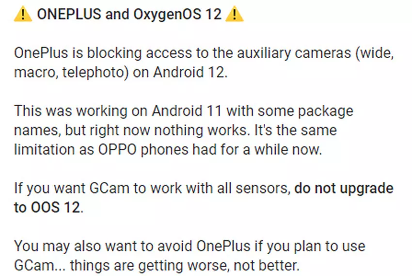 Na urządzeniach z systemem OxygenOS 12 aplikacjom innych firm, w tym Google Camera, odmówiono dostępu do modułów pomocniczych. Oznacza to, że będziesz mógł używać tylko głównego czujnika aparatu, ale na przykład „shirik” i teleobiektyw nie. Nie będziesz mógł z nich korzystać, nawet jeśli aplikacje wcześniej działały poprawnie z aparatami.