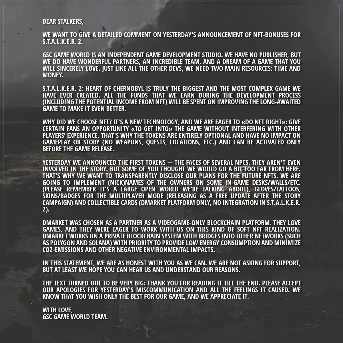 GSC Game World oficjalnie ogłosiło, że ze względu na reakcje graczy anuluje wszystkie działania NFT w S.T.A.L.K.E.R. 2: Serce Czarnobyla. Co ciekawe, wcześniej deweloper opublikował inne oświadczenie. Tekst można znaleźć na poniższym zrzucie ekranu.