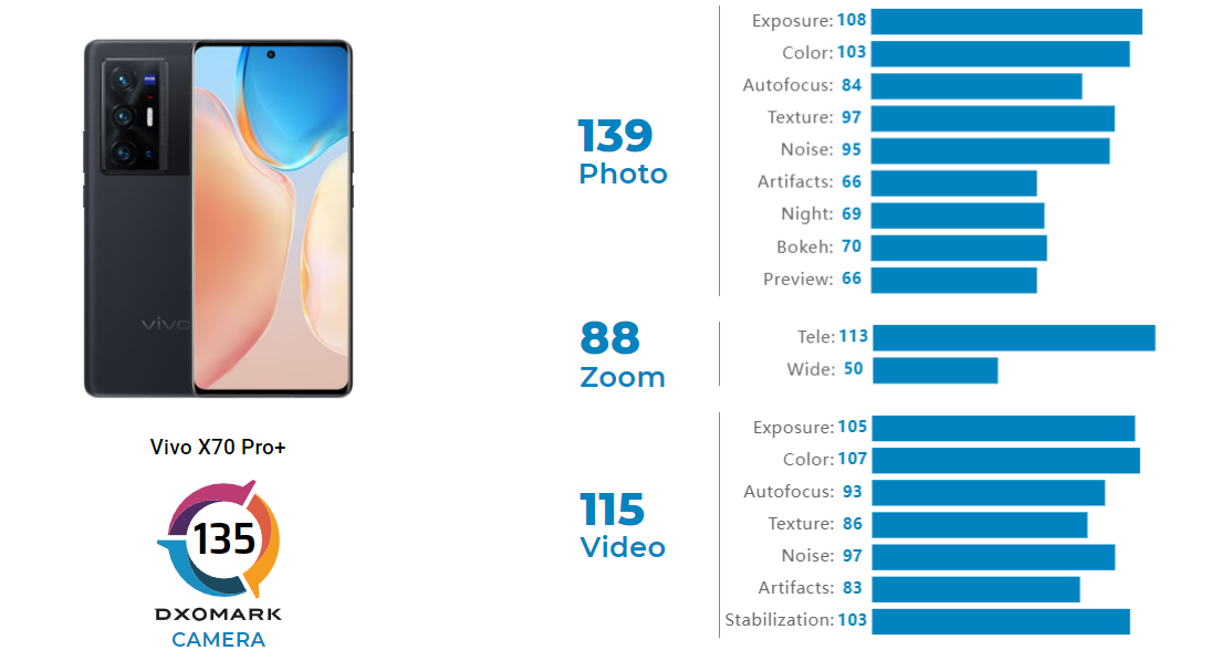 Możliwości fotograficzne smartfona zostały ocenione na 139 punktów. Osobno warto zwrócić uwagę na 88 punktów za zoom, 69 punktów za fotografowanie w nocy i 50 punktów za ultraszerokokątny aparat. Vivo X70 Pro + zdobył 115 punktów za kręcenie filmów.