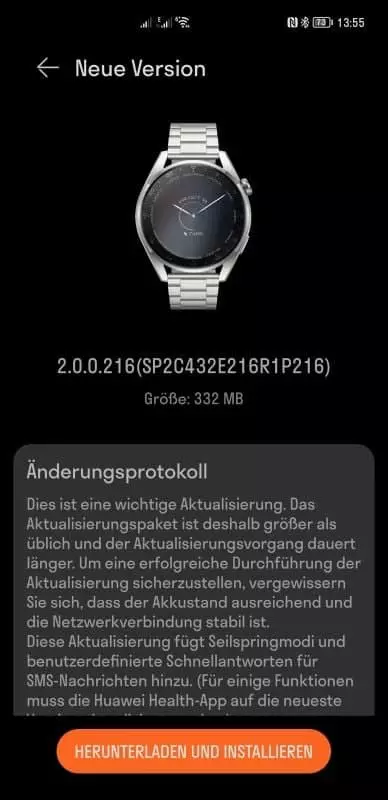 Oprogramowanie układowe zostało wydane pod numerem HarmonyOS 2.0.0.216 i otrzymało wiele przydatnych zmian. Na przykład system dodał tryb treningu linowego, nowe tarcze zegarka dla trybu oszczędzania energii i możliwość szybkiego odpowiadania na wiadomości SMS. Dodatkowo zegarek otrzymał możliwość zarządzania multimediami, poprawki błędów oraz kilka nowych języków. Twórcy zoptymalizowali także interfejs urządzenia oraz pulsometr podczas odpoczynku i pływania.