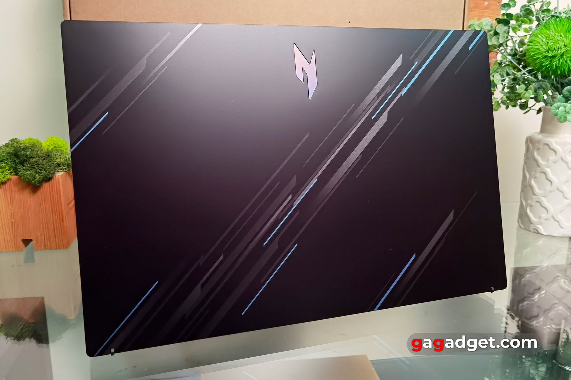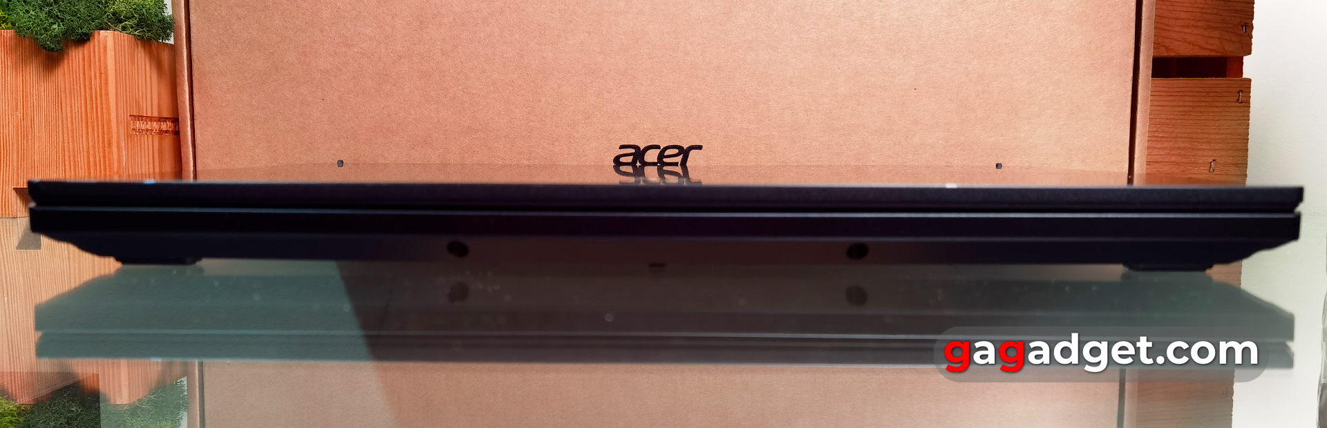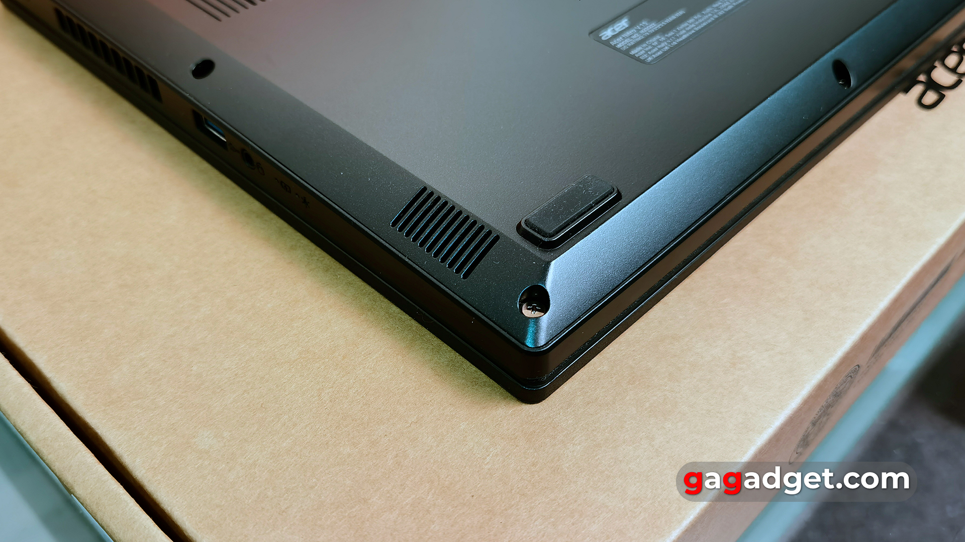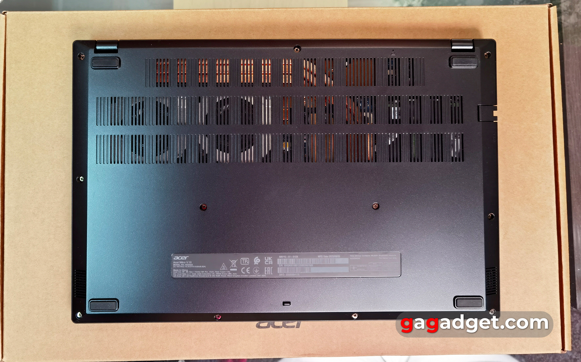 Na spodzie laptopa znajduje się wiele otworów wentylacyjnych, przez które widoczne są rurki cieplne i dwa wentylatory chłodzące. Na obwodzie znajdują się cztery standardowe gumowe nóżki, które zapobiegają ślizganiu się laptopa na stole. W małym otworze z tyłu laptopa znajduje się przycisk resetowania. Dolna pokrywa jest zabezpieczona 11 śrubami z łbem krzyżakowym, dzięki czemu można ją łatwo zdjąć. Pod nią użytkownik ma dostęp do wymiany dwóch pasków pamięci RAM i dwóch złączy M.2, z których jedno jest zajęte przez dołączony dysk SSD. Omówimy je bardziej szczegółowo później.
