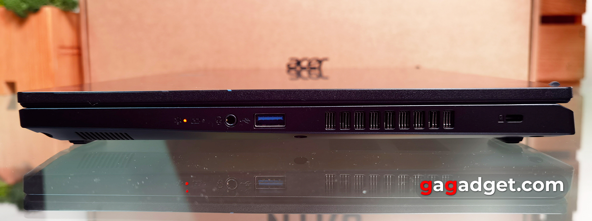 Po przeciwnej stronie znajduje się gniazdo Kensington Lock, otwory wentylacyjne, kolejny pełnowymiarowy port USB 3.2 Gen 1, gniazdo audio 3,5 mm i wskaźniki stanu LED.