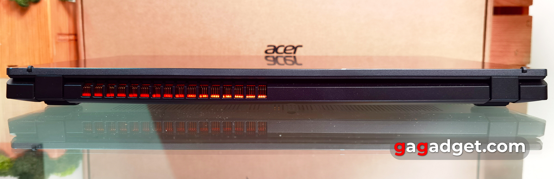 Z przodu nie ma żadnych funkcjonalnych elementów. Z tyłu znajdują się dwa zawiasy, duży obszar z otworami chłodzącymi i dwie gumowe wkładki, które podtrzymują laptopa w pozycji otwartej.