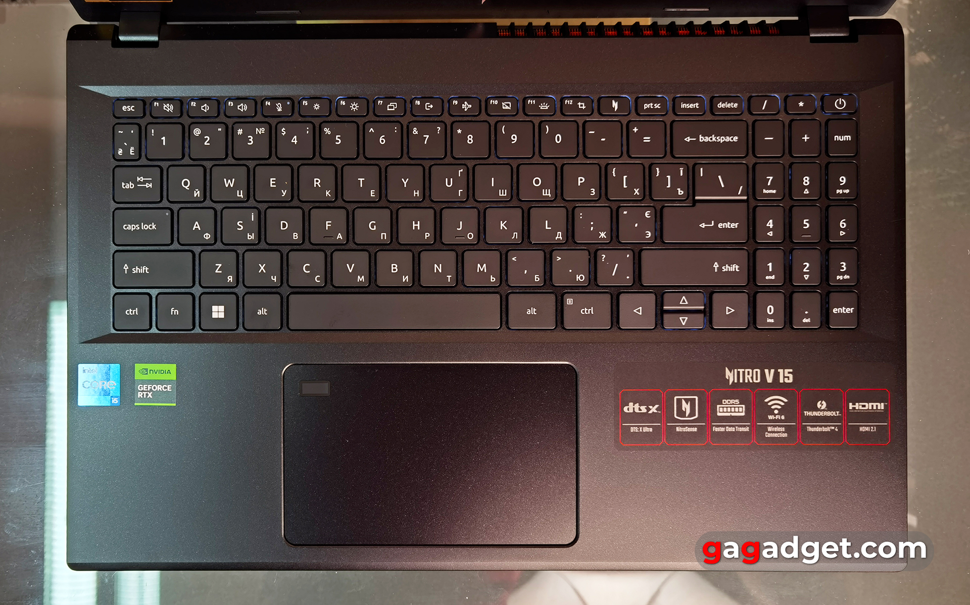Zawiasy ułatwiają otwieranie laptopa jedną ręką, a pokrywa dobrze blokuje się w pożądanej pozycji. Jednocześnie wykorzystujemy znaną nam już konstrukcję: po otwarciu tył jednostki głównej lekko unosi się nad stołem. Tworzy to przestrzeń pod spodem, która pozwala na lepsze chłodzenie komponentów. Maksymalny kąt otwarcia wynosi około 135°. Acer Nitro V 15 posiada pełnowymiarową klawiaturę z dodatkowym blokiem numerycznym, który jest umieszczony blisko głównego. Przyciski w górnym rzędzie funkcyjnym są nieco mniejsze. Oprócz standardowego zestawu, w rzędzie znajdują się przyciski, które nie pasują do klawiatury numerycznej, a także osobny przycisk do uruchamiania oprogramowania Nitro Sense. Rząd kończy się przyciskiem zasilania. Blok strzałek nie jest w żaden sposób oddzielony, a strzałki w górę i w dół są mniejsze. Obie zmiany są długie. Ogólnie układ jest dość wygodny, przyzwyczajenie się do niego nie zajmuje dużo czasu.