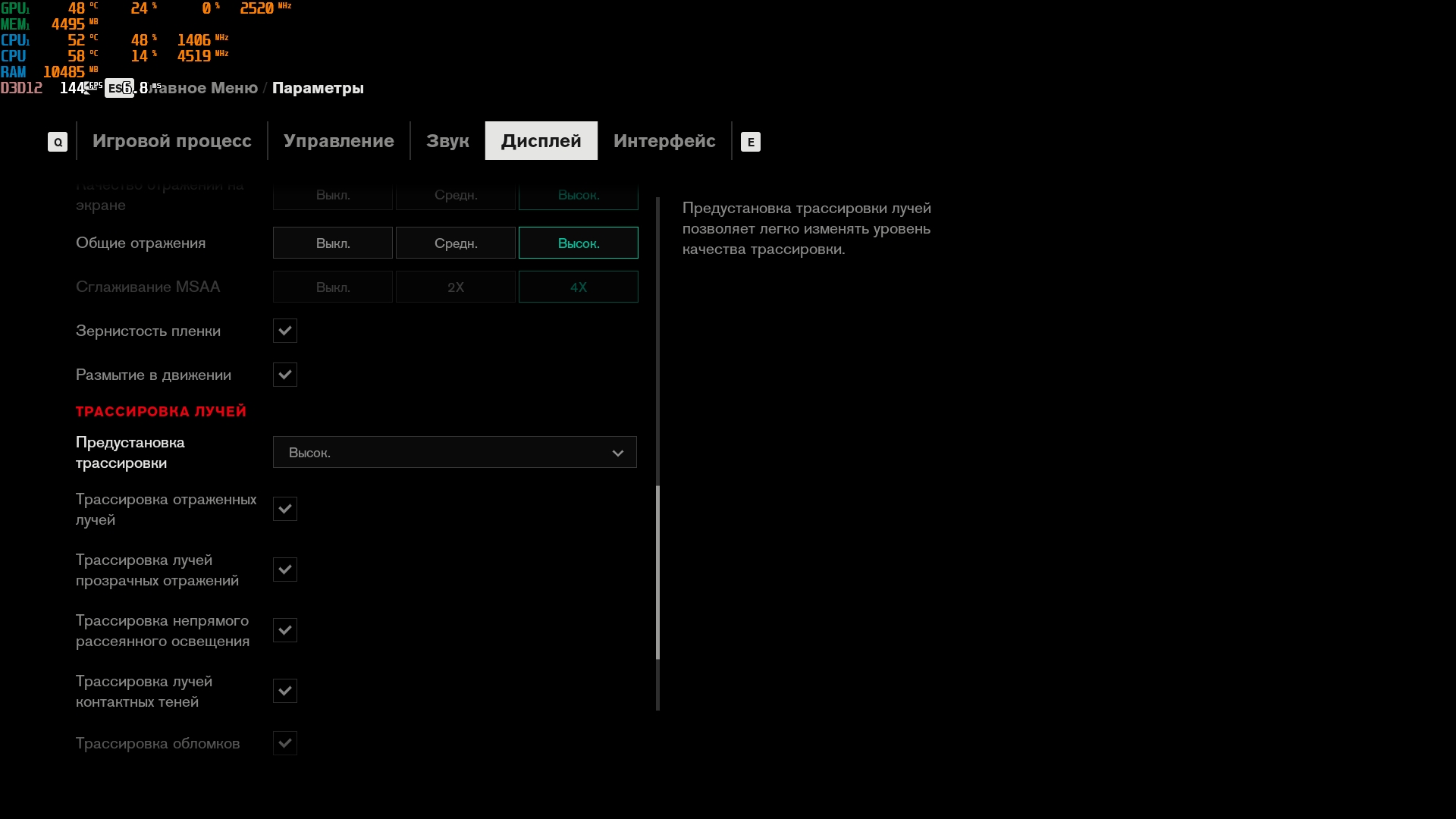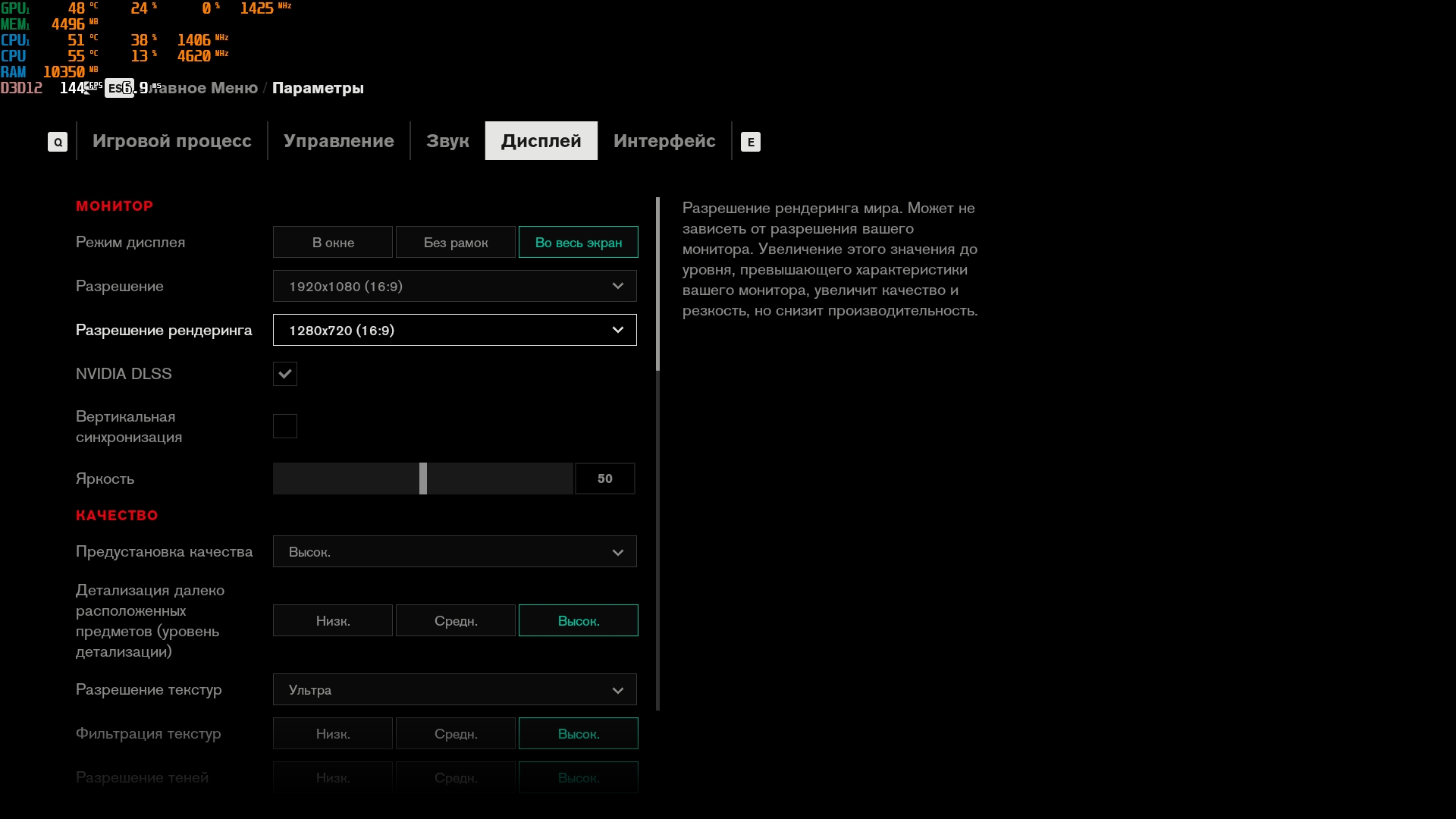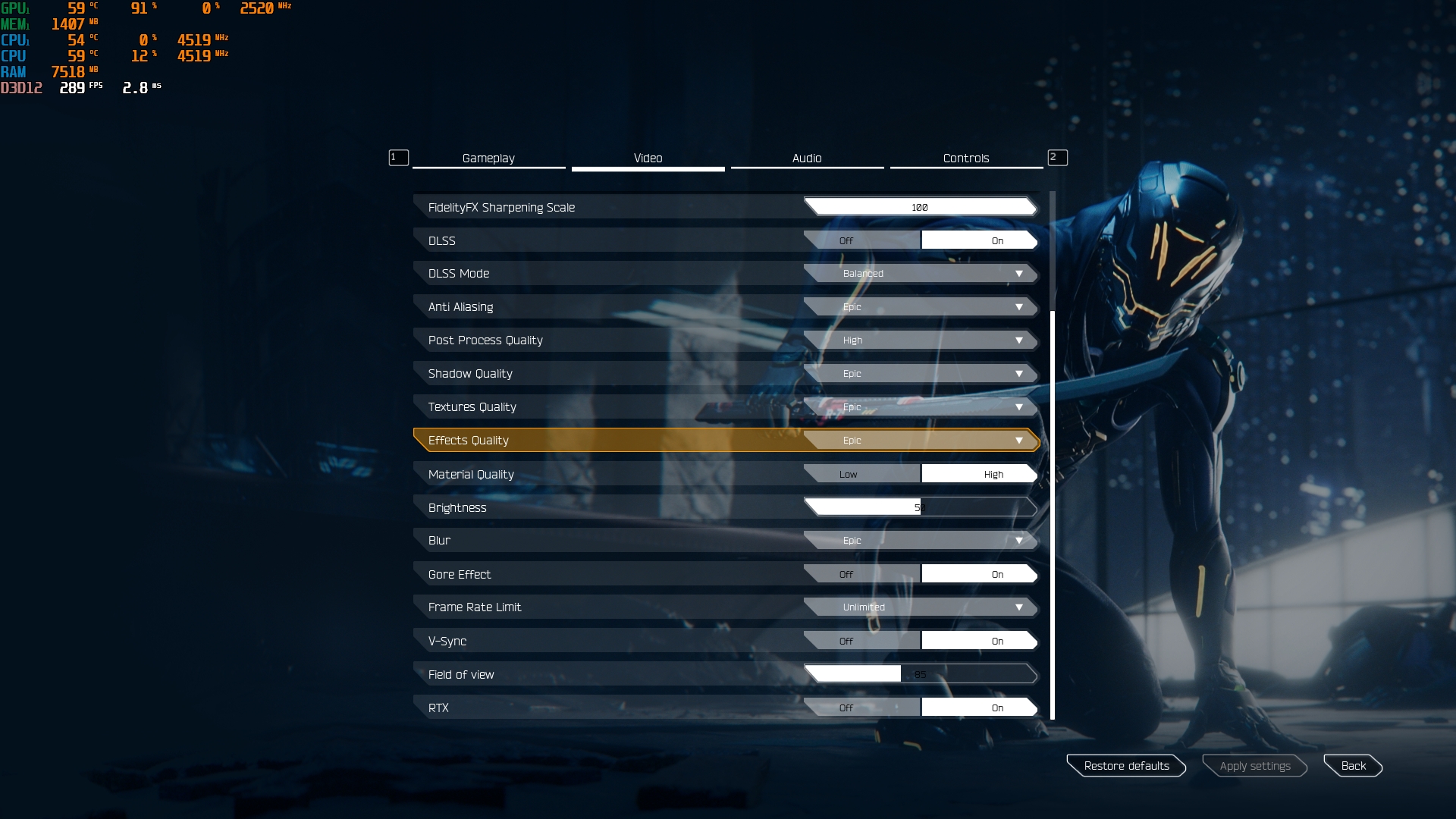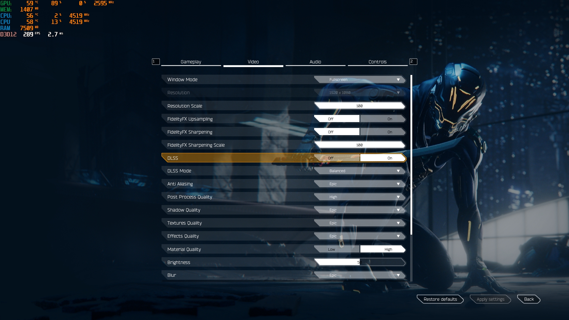 - Ghostrunner. Maksymalne ustawienia, ray tracing, DLSS w trybie zrównoważonym: 35-55 FPS.