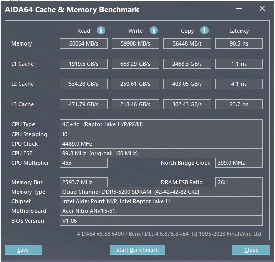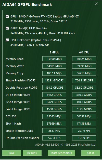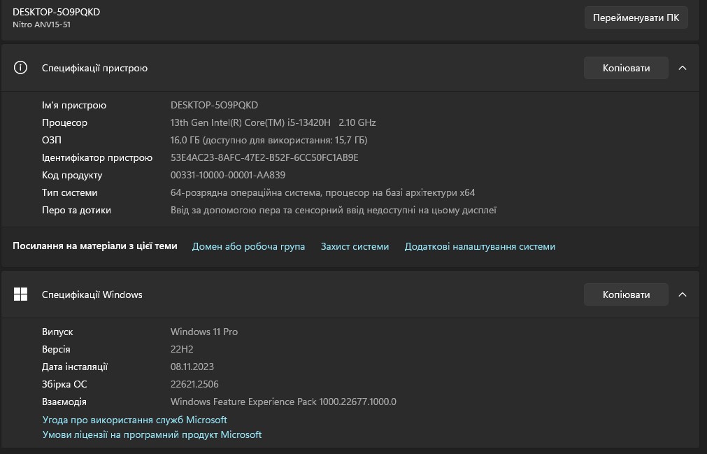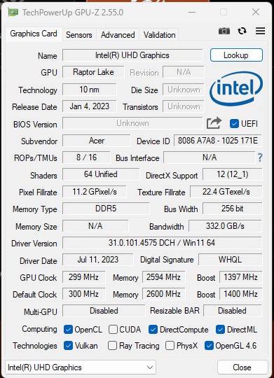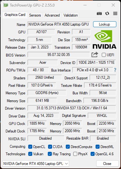 Acer Nitro V 15 ANV15-51 otrzymał procesory Intel Raptor Lake 13. generacji. Dostępne są konfiguracje z Core i5 oraz i7. Recenzowany laptop został wyposażony w procesor Intel Core i5-13420H. Posiada on 4 wydajne rdzenie o częstotliwości 2,1-4,6 GHz oraz 4 energooszczędne rdzenie o częstotliwości 1,5-3,3 GHz. Obsługuje obliczenia wielowątkowe: do 12 wątków, 12 MB pamięci podręcznej poziomu 3. Procesor jest produkowany przy użyciutechnologii procesowej Intel 7 i ma TDP 45 W (z możliwym krótkoterminowym wzrostem do 95 W). Procesor posiada wbudowany prosty układ graficzny Intel UHD Graphics (48EU), który posiada 48 jednostek obliczeniowych i pracuje z częstotliwością 300-1400 MHz. Zastosowana dyskretna karta graficzna to dobrze znana zlaptopów NVIDIA GeForce RTX 4050, która jest stosowana w różnych wariantach w dzisiejszych niedrogich laptopach do gier. Moc obliczeniowaAcer Nitro V 15 TGP wynosi 75W (60W plus PredatorSense Boost 15W). To raczej skromne rozwiązanie, ale na rynku są modele gamingowe z GeForce RTX 4050 Laptop o mocy 45W, więc nie jest źle. Dla przypomnienia, karta graficzna dysponuje 2560 rdzeniami CUDA, 80 jednostkami teksturującymi, 32 jednostkami rasteryzującymi, 80 rdzeniami tensorowymi czwartej generacji i 20 rdzeniami RT trzeciej generacji. W podstawowej wersji GPU pracuje z częstotliwością 2130 MHz, którą można zwiększyć do 2230 MHz. Ilość pamięci wideo wynosi 6 GB GDDR6. Do dyspozycji jest 16 GB pamięci RAM DDR5-5200, z dwoma 8 GB paskami, które można wymienić. Laptop jest wyposażony wdwuzakresowy moduł Wi-Fi 802.11 a/b/g/n/ac/ax z obsługą 2x2 MU-MIMO, Bluetooth 5.2 i przewodowy Gigabit Ethernet.