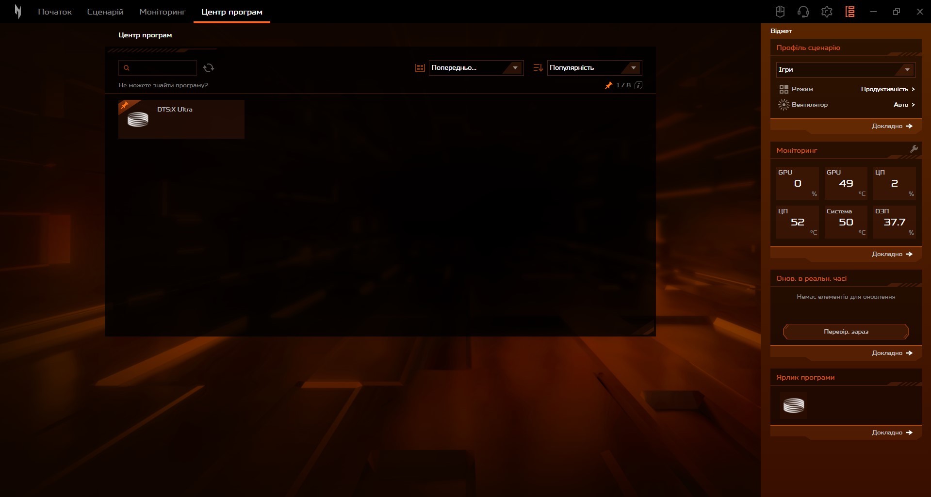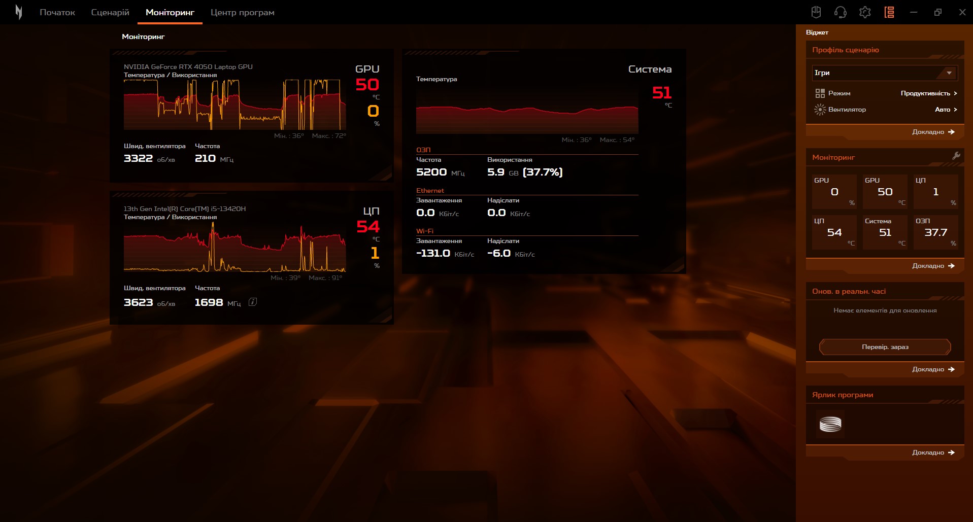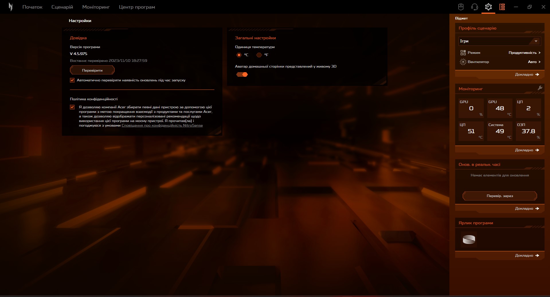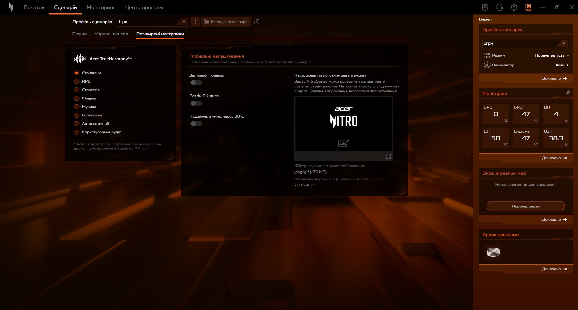 Aplikacja Nitro Sense służy do zdecydowanej większości ustawień laptopa. Ma ona zaktualizowany interfejs, ale podstawowa funkcjonalność pozostaje znajoma. Dostępne są ustawienia dotyczące wydajności, działania systemu chłodzenia, aktualizacji, monitorowania systemu, ustawień dźwięku, podkręcania matrycy i nie tylko.