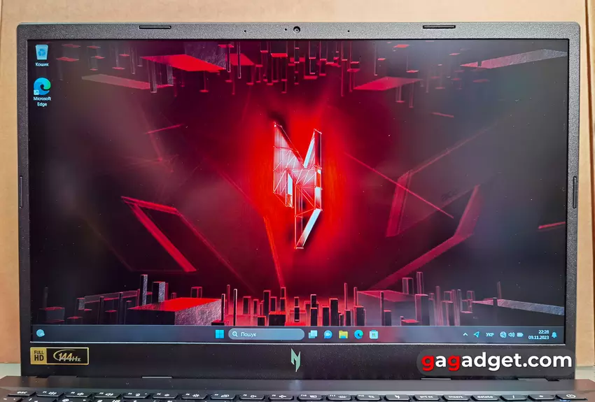 Acer Nitro V 15 ANV15-51 został wyposażony w ekran IPS o przekątnej 15,6 cala i rozdzielczości 1920x1080. Częstotliwość odświeżania wynosi 144 Hz. Ekran posiada dość skuteczną powłokę antyrefleksyjną. Kolory nie są zbyt nasycone, widać, że zastosowano dość budżetową matrycę. Kąty widzenia są jednak dobre, a spadek kontrastu nie jest zbyt duży. Jasność jest w zupełności wystarczająca do pracy w pomieszczeniach. Pomiary wykazały, że maksymalna jasność wynosi 245,133 cd/m², jasność czarnego pola 0,235 cd/m², a kontrast statyczny 1043:1, czyli całkiem normalnie jak na niedrogi model do gier. Paleta barw jest nieco węższa niż sRGB, ale dokładność odwzorowania kolorów jest bardzo dobra. Temperatura barwowa jest bliska 6000K, a wartość referencyjna wynosi 6500K.