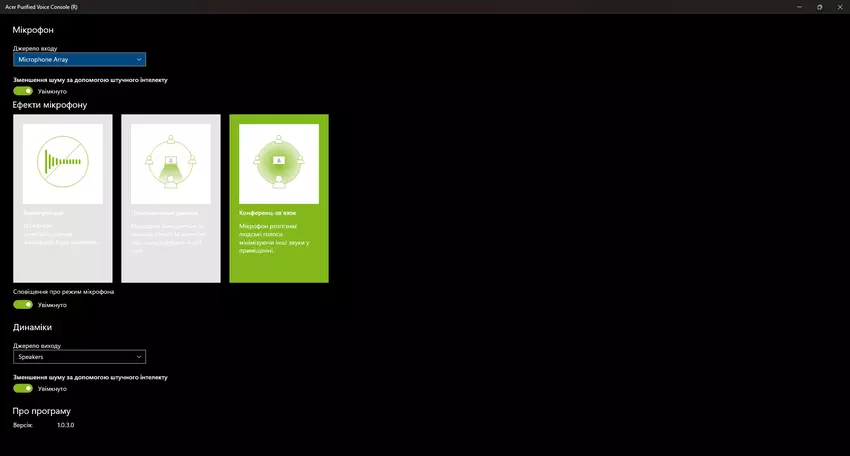Aplikacja Acer Purified Voice Console zawiera ustawienia mikrofonu, w tym tryby do wideokonferencji i redukcji szumów z wykorzystaniem uczenia maszynowego.
