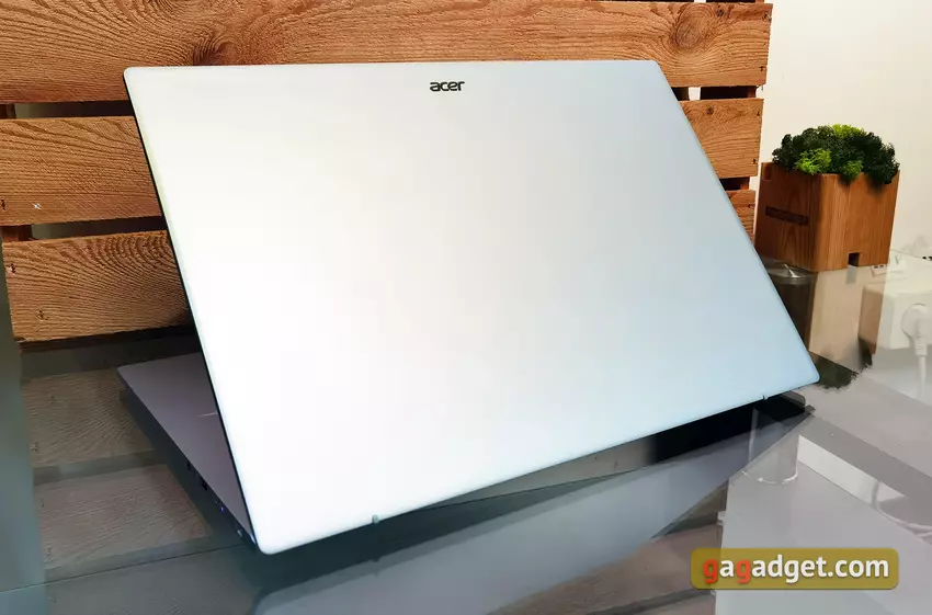 Ogólnie rzecz biorąc, linia laptopów Acer Swift zawsze wyróżniała się kompaktowymi rozmiarami i niewielką wagą. Na przykład Swift 5 był pierwszym 14-calowym laptopem, który ważył mniej niż 1 kg. Acer Swift Edge kontynuuje tę tradycję: jest to obecnie najlżejszy laptop z 16-calowym wyświetlaczem. Obudowa prawie w całości wykonana jest ze stopu magnezu z aluminium (jedynie ramka wokół ekranu jest plastikowa). Producent twierdzi, że stop ten jest o 20% lżejszy i dwukrotnie bardziej wytrzymały od aluminium. Waga laptopa to zaledwie 1,17 kg, co biorąc pod uwagę przekątną wyświetlacza jest naprawdę imponujące. Trafił do nas wariant Flax White. Jest prawie biały, ale lekko mieni się pod promieniami światła. Wszystkie powierzchnie mają chropowate wykończenie, z elementów dekoracyjnych jest tylko małe logo Acer na górnej pokrywie.