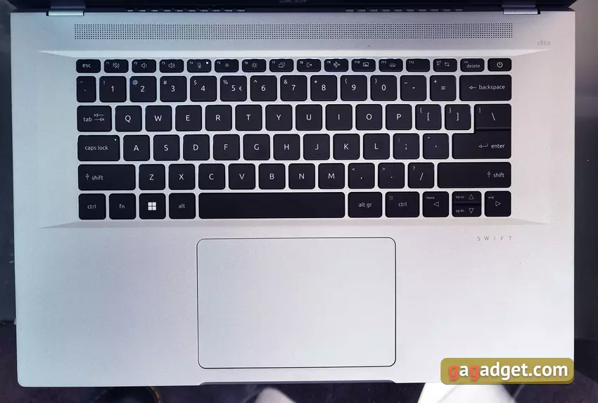 Klawiatura w Acer Swift Edge jest ogólnie bardzo dobra, ale jest kilka aspektów, które można by poprawić. Układ jest absolutnie standardowy dla 13,3 lub 14-calowych ultrabooków. Bez dodatkowego bloku cyfrowego. Biorąc pod uwagę wielkość i wolną przestrzeń na powierzchni roboczej, zmieściłby się tam całkiem dobrze. Wszystko inne jest realizowane absolutnie standardowo. Górny rząd przycisków funkcyjnych ma zmniejszony rozmiar i jest zdublowany z dodatkowymi funkcjami, w tym głośnością, jasnością, podświetleniem klawiatury i wyciszeniem mikrofonu. Rząd kończy się przyciskiem zasilania z wbudowanym skanerem linii papilarnych. Home, End, PgUp i PgDn są zdublowane strzałkami przez Fn. Oba Shift są długie, Enter jest jednopoziomowy.