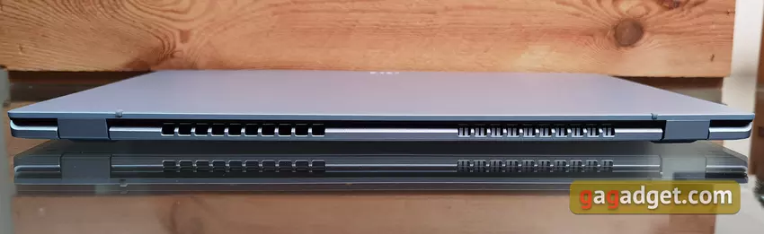 Z tyłu znajdują się dwa obszary otworów układu chłodzenia, dwa zawiasy po bokach oraz dwie małe gumowe wkładki, na których laptop spoczywa w pozycji otwartej.
