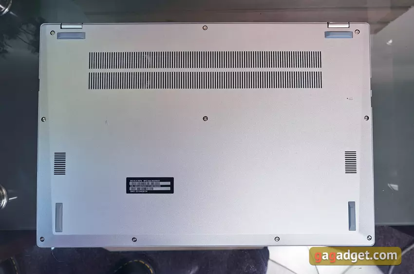 Poniżej znajduje się niemal standardowy zestaw elementów funkcjonalnych. Cztery gumowe nóżki, otwory wentylacyjne, głośniki i przycisk Reset w małym otworze.
