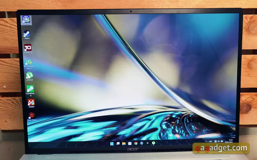 Wyświetlacz to jedna z najciekawszych cech Acer Swift Edge. Ma on przekątną 16 cali, proporcje 16:10 i rozdzielczość 4K+ (3840x2400). Zastosowano w nim matrycę OLED o 100% gamie kolorów DCI-P3, jasności maksymalnej 400 cd/m², szczytowej 500 cd/m² (w trybie HDR), czasie reakcji piksela 0,2 ms i częstotliwości odświeżania 60 Hz. Wizualnie wyświetlacz sprawia bardzo przyjemne wrażenie: obraz jest bardzo wyraźny dzięki wysokiej rozdzielczości i ma bardzo bogate kolory. Kąty widzenia są maksymalne. Pomiar sprzętowy wykazał, że maksymalna jasność prawie odpowiada deklarowanemu wskaźnikowi: 387,019 cd/m².Paleta barw ekranu jest zauważalnie szersza od zakresu sRGB, kalibracja jest bardzo dobra, odchylenie w kierunku chłodnych odcieni jest minimalne: