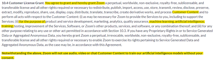 11 sierpnia Zoom usunął ze swoich warunków świadczenia usług klauzulę, która mówiła o możliwym wykorzystaniu danych klientów do szkolenia algorytmów sztucznej inteligencji.