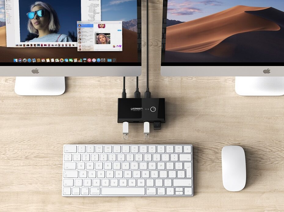 Czasami musisz użyć dwóch komputerów i jednego zestawu klawiatur z myszką, to urządzenie uprości interakcję. W rzeczywistości jest to podwójny koncentrator USB, za naciśnięciem jednego przycisku pozwala przełączać się między podłączonymi systemami. Posiada 4 porty USB 3.0, 2 aktywne wskaźniki, przycisk przełącznika, port microUSB dla dodatkowej mocy. Dostępna jest również wersja USB 2.0.
