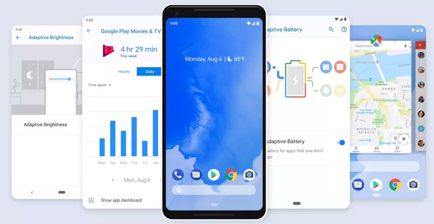 - 9.0 Pie (9 sierpnia 2018): adaptacyjna jasność i zużycie baterii - nieużywane aplikacje są wyłączane w celu oszczędzania energii, funkcja Digital Wellbeing do śledzenia czasu pracy aplikacji i limitów użytkownika dla aplikacji, nowe gesty w interfejsie użytkownika, aplikacje mogą mieć przyciski z akcjami, które przewidują intencje użytkownika (np. uruchomienie listy odtwarzania po podłączeniu słuchawek), obsługa zewnętrznych kamer i do 5 jednocześnie podłączonych urządzeń Bluetooth.
