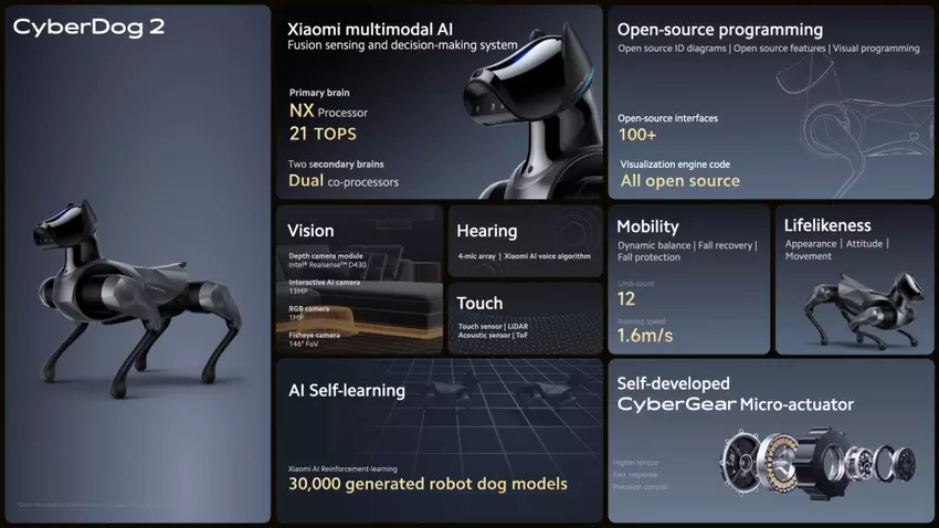 CyberDog 2 wygląda jak pies rasy doberman. Waży 8,9 kg i ma 36,7 cm wysokości. Firma twierdzi, że robot jest wyposażony w opatentowane przez Xiaomi siłowniki CyberGear, które zapewniają wysoki poziom manewrowości.