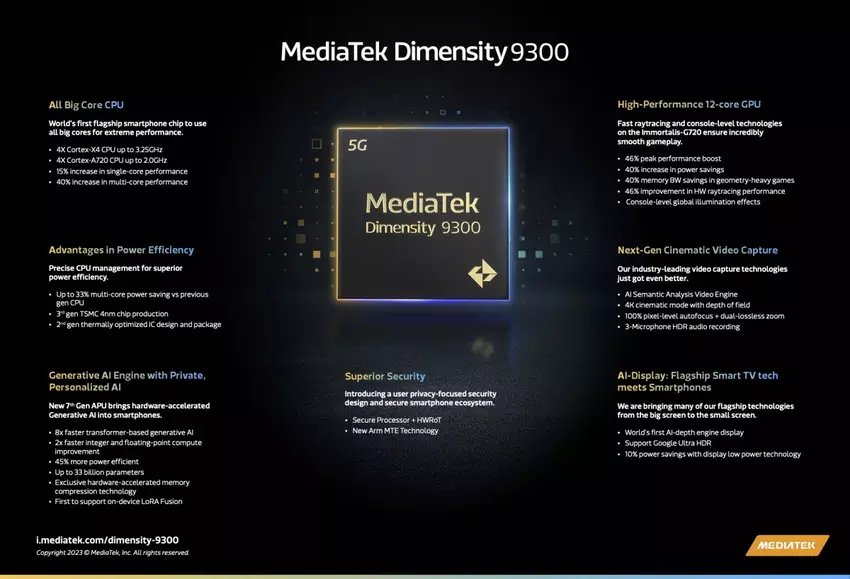 Układ został nazwany Dimensity 9300. SoC oparty jest na technologii procesowej TSMC trzeciej generacji 4nm+. Jego cechą wyróżniającą jest wielordzeniowa konstrukcja: pojedynczy rdzeń Cortex-X4 taktowany zegarem 3,25 GHz, trzy rdzenie Cortex-X4 taktowane zegarem 2,85 GHz i cztery rdzenie Cortex-A720 taktowane zegarem 2,0 GHz oparte na architekturze Armv9.