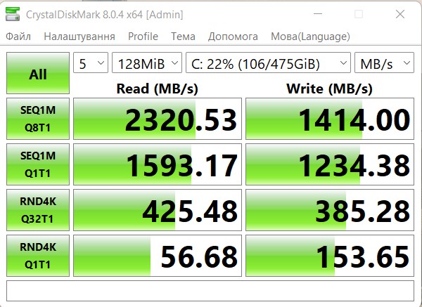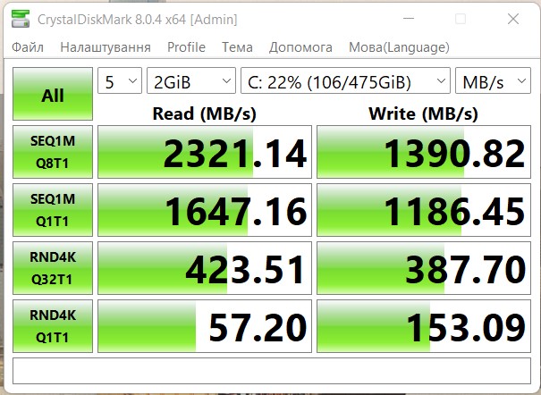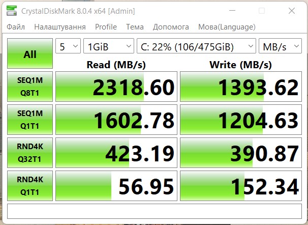 Prędkości dysków SSD są nieco wyższe niż podano. Odczyt - około 2300 MB/s i zapis - 1400 MB/s: