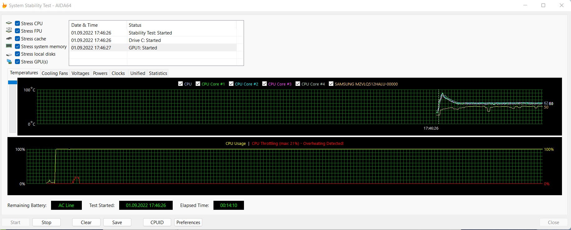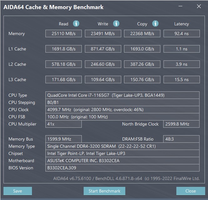 Układ chłodzenia w ASUS ExpertBook B5 jest pozbawiony jakichkolwiek cech konstrukcyjnych. W jego skład wchodzi chłodnica, rurka cieplna i jeden wentylator. Okazało się jednak, że jest zaskakująco wydajny, choć to także zasługa energooszczędnego procesora. W stress teście AIDA64 podczas maksymalnego obciążenia od samego początku podzespoły nagrzewają się do około 90° i procesor traci wydajność. W ciągu około minuty system chłodzenia dostosowuje się do obciążenia, układ pracuje z maksymalną wydajnością, a temperatura komponentów utrzymuje się w okolicach 60°. W zastosowaniach biurowych system chłodzenia nie jest słyszalny. Pod obciążeniem hałas jest minimalny. Obudowa nad klawiaturą staje się tylko trochę ciepła.
